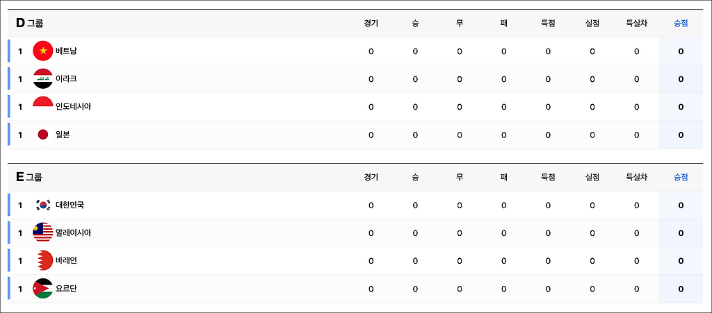 우리나라는 E조에 속해있고, 일본은 D조에 포함되어 있네요.