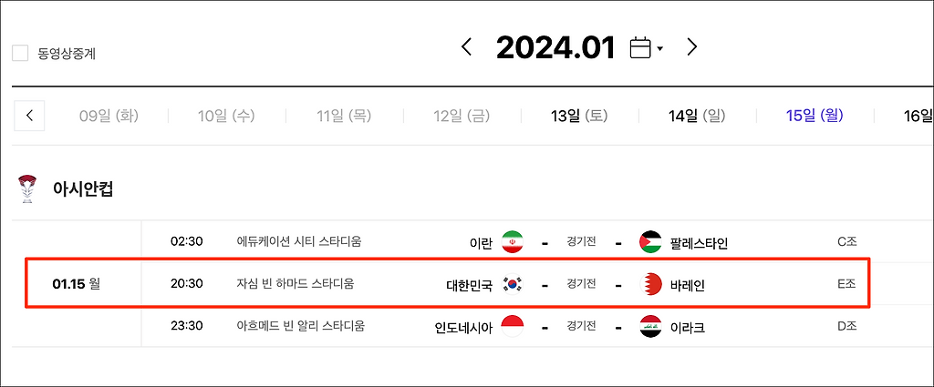 1월 15일 (월) 저녁 8시 30분에 바레인하고 1차전이 진행됩니다.