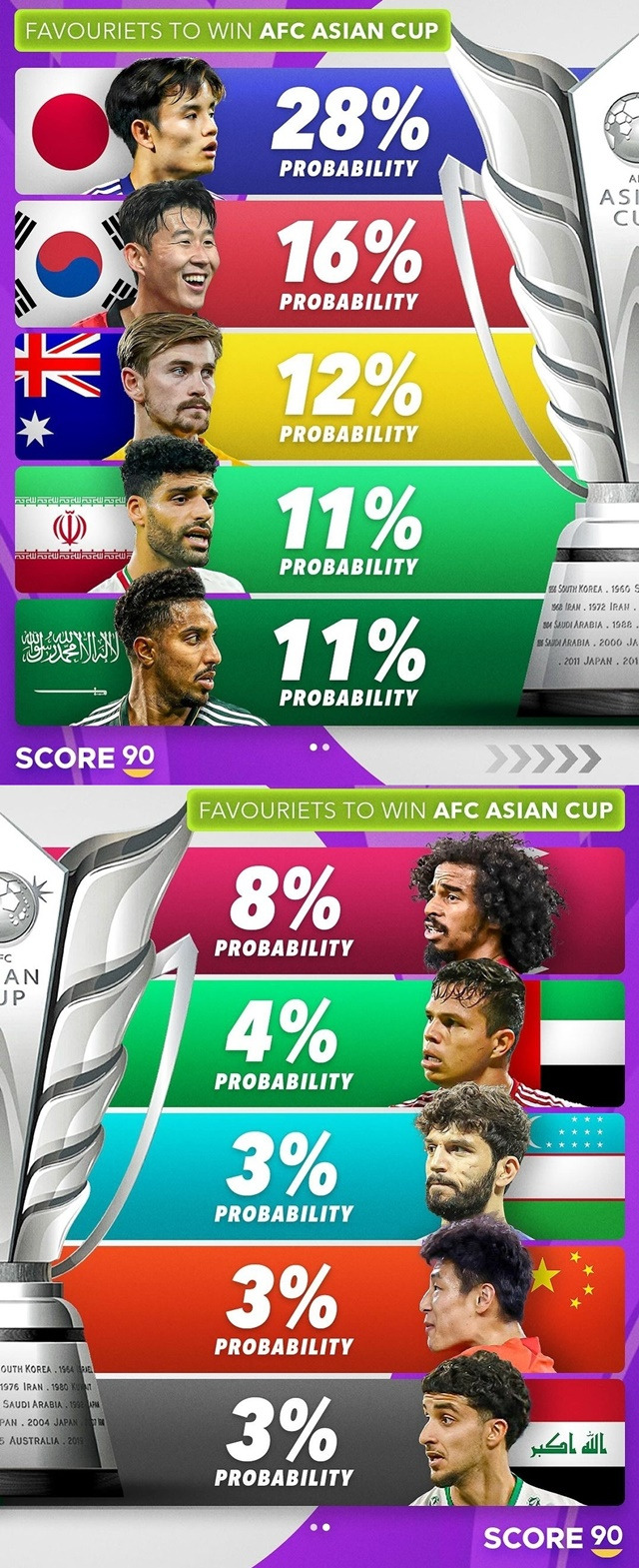 아시안컵 나라별 우승확률, 한국이 16%로 일본이 이어 2위