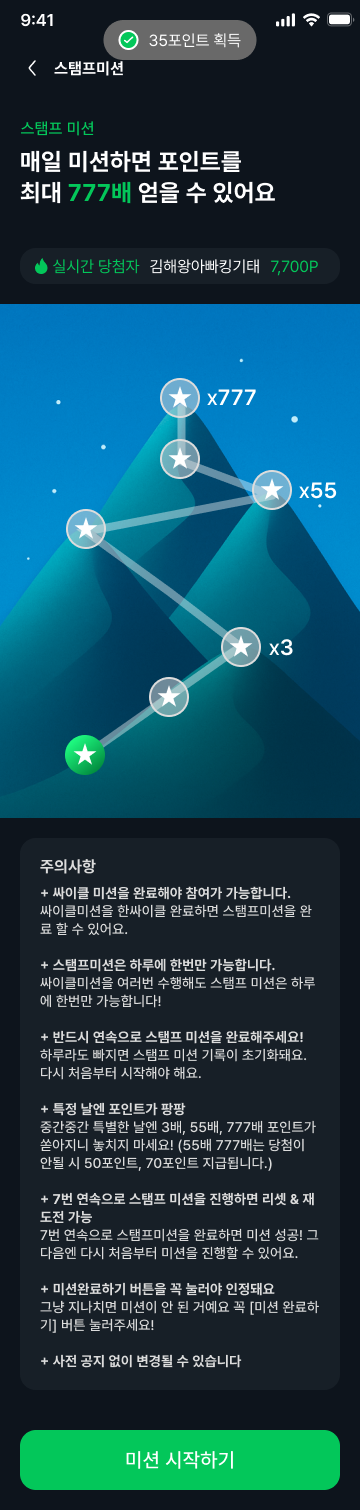 5일차/7일차에 55배, 777배 확률 뽑기 가능.
