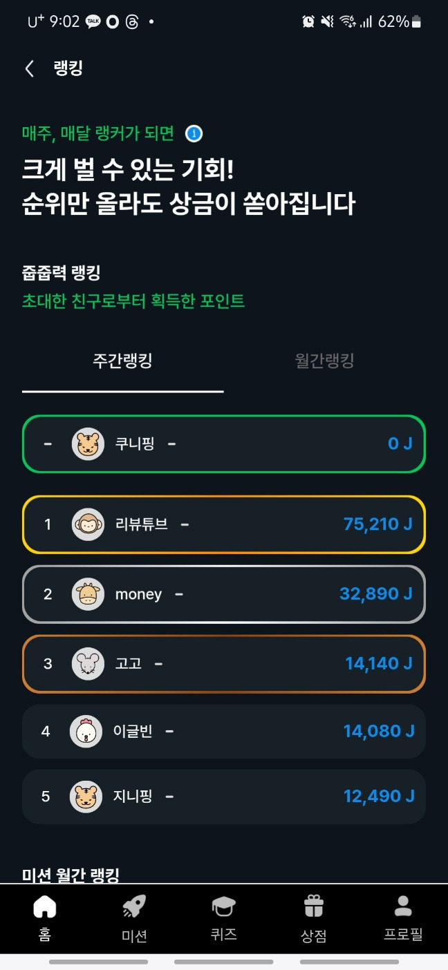 줍줍력 기준으로 주간/월간 랭킹 매기고,