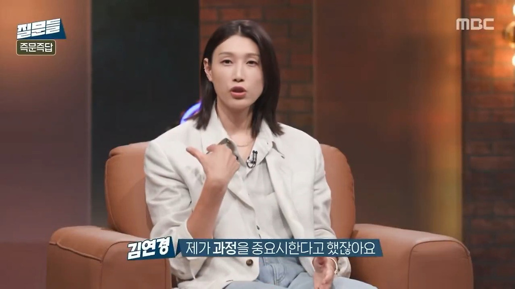 김연경 : 제가 과정을 되게 중요시한다고 했잖아요? 근데 그 과정 속에서 저는 준비가 다 되어 있습니다. 모든 상황에 대해서. 그래서 '내가 어떻게 이 경기에 임해야지' 라고 계속해서 시뮬레이션을 저혼자 돌리기 때문에 (예를들어) 24대 24, 상대는 튀르키예, 이 상황에 왔을 때 '나는 어디로 공략을 해야지'가 이미 이미지트레이닝으로 트레이닝이 되어있고, 그런 상황에서 좀 긴장을 좀 덜 하고 그 상황을 잘 극복하지 않았나..