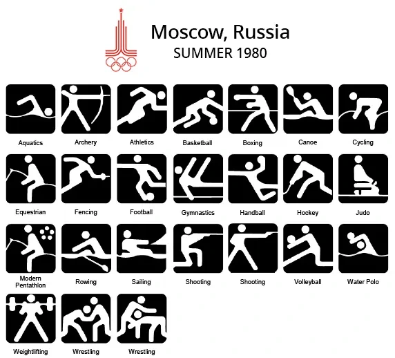 아직 동독이 있던 시절 서독 디자인을 재탕하기엔 소련의 자존심이 상했던 것일까? 그래도 대히트를 넘어 하나의 비언어적 문법으로 자리잡은 뮌헨 올림픽 픽토그램을 무시할 수 없었기 때문에 기존보다 부드러운 느낌을 주게끔, 30도, 60도로 각들을 둥글게 깍아주고었고 머리를 제외한 몸통을 전부 이어그림으로써 하나로 연결되었다는 느낌을 강조했다고 함. 그런데 그냥 원덬 눈에는 시인성 폭락한 똥망 디자인으로만 보임… 😔