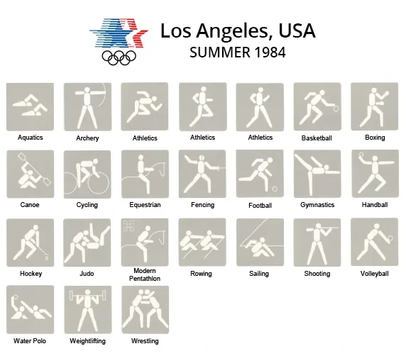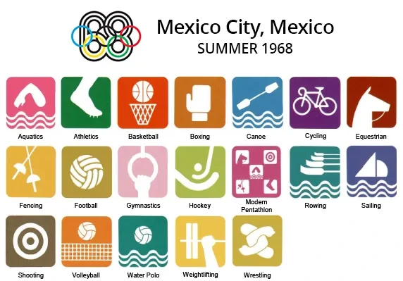 우리가 아는 그 형태의 픽토그램이 등장한 최초의 올림픽으로 그 전까지 종목소개를 단순히 영어같은 국제 표준어로 “Swimming” 이렇게 문자 표기 방식으로 진행했는데, 도쿄 올림픽을 기점으로 픽토그램을 사용하여 종목소개를 하기 시작함
