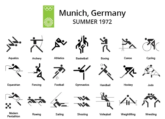 도쿄와 비교하면 불필요한 곡선들을 삭제하면서 시인성이 개선 됨. 누가 독일 아니랄까봐 철저하게 45도 90도 각도로 선들을 표현하였고, 단순히 도쿄 올림픽 픽토그램를 개선하는데서 그친게 아니라 “엥? 이게 이거라고…?” 싶은 몇몇 픽토그램은 아예 새로 뜯어고침. 결국 독일이 제안한 이 픽토그램이 향후 올림픽 픽토그램 국제 표준이 됨. 이후로 나오는 픽토그램들은 다 뮌헨 올림픽의 파생형이라고 볼 수 있다
