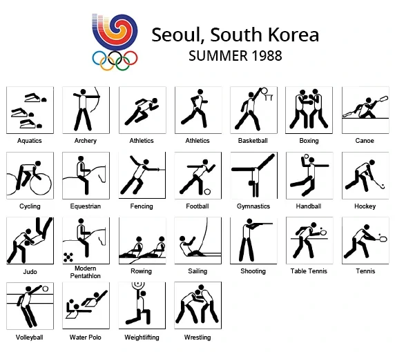 그리고 이 픽토그램은 사실 1986 아시안게임의 재탕인데, 왜냐면 이때 아시안 게임이 서울 아시안 게임이라 2년 간격으로 국제 체육 대회를 두 번이나 치룸으로써 서울 올림픽은 합법적인 재탕으로 예산을 상당수 아낄 수 있었고, LA 올림픽에 이어 두 번째 흑자 올림픽이 되었다고 한다.