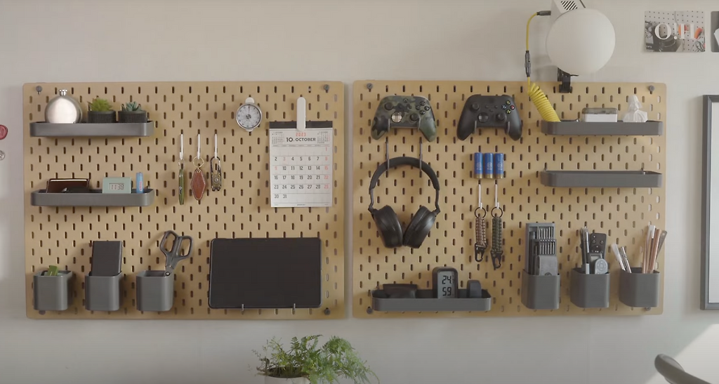 – ‘브레넨스툴 멀티탭’은 철망에 고정하여 사용하며, 선방에는 캠핑 고리와 조명을 걸어두었고 충전 케이블은 타공판에 모아 두어 편리하다.