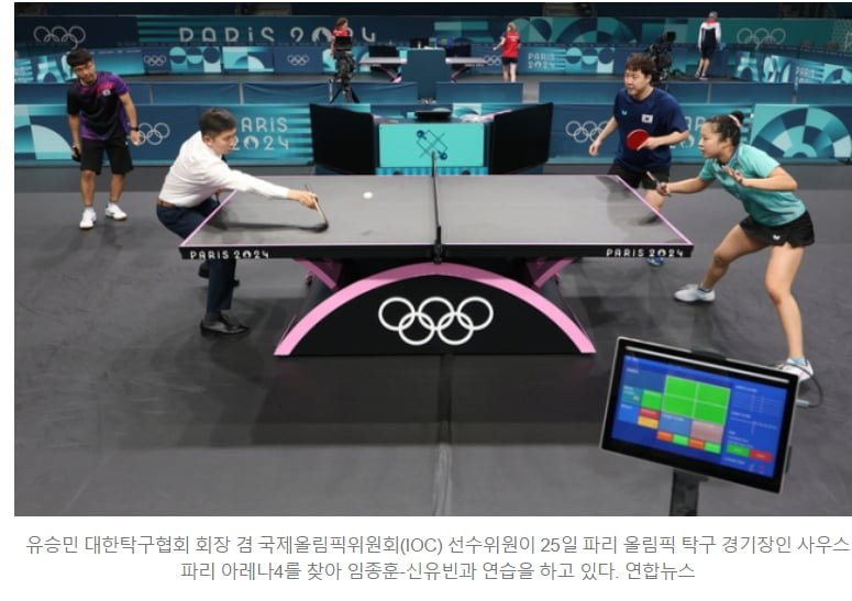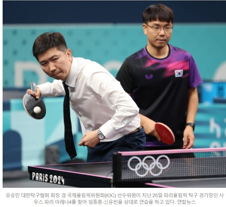임종훈-신유빈 조의 혼합복식 1회전상대가 요즘은 사실상 사장된 펜홀더 타법을 사용하는 선수라서 연습 상대가 없는 상황펜홀더에 대한 대비는 필요한데스파링 상대는 없으니일단 급한대로 IOC 선수위원이자 대한탁구협회장인2004년 아테네 올림픽 탁구 금메달리스트유승민을 스파링 상대로 투입옛날식 탁구를 많이 상대해본탁구 고인물 긴급투입