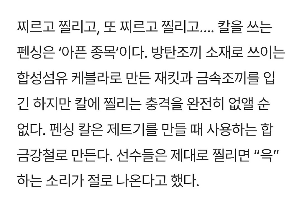 펜싱 칼은 마레이징 강철을 사용한다. 마레이징은 제트 전투기를 만들 때 쓰는 합금강철이다. 그래서