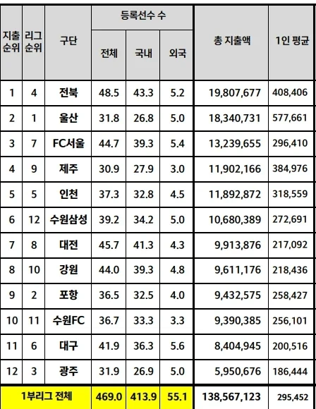 전북 울산이 기준인가요? 리그 5위 연봉인데?