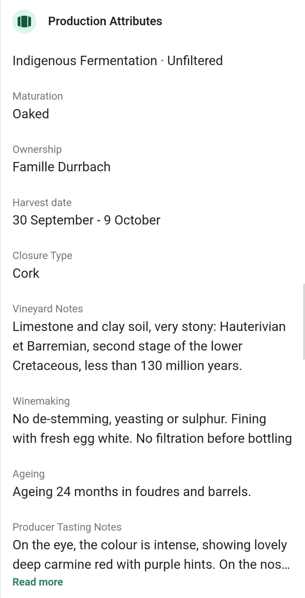 밭에서는 일절 화학물질을 사용하지 않고, 25~30h/ha로 수확량을 제한하여 포도의 맛을
