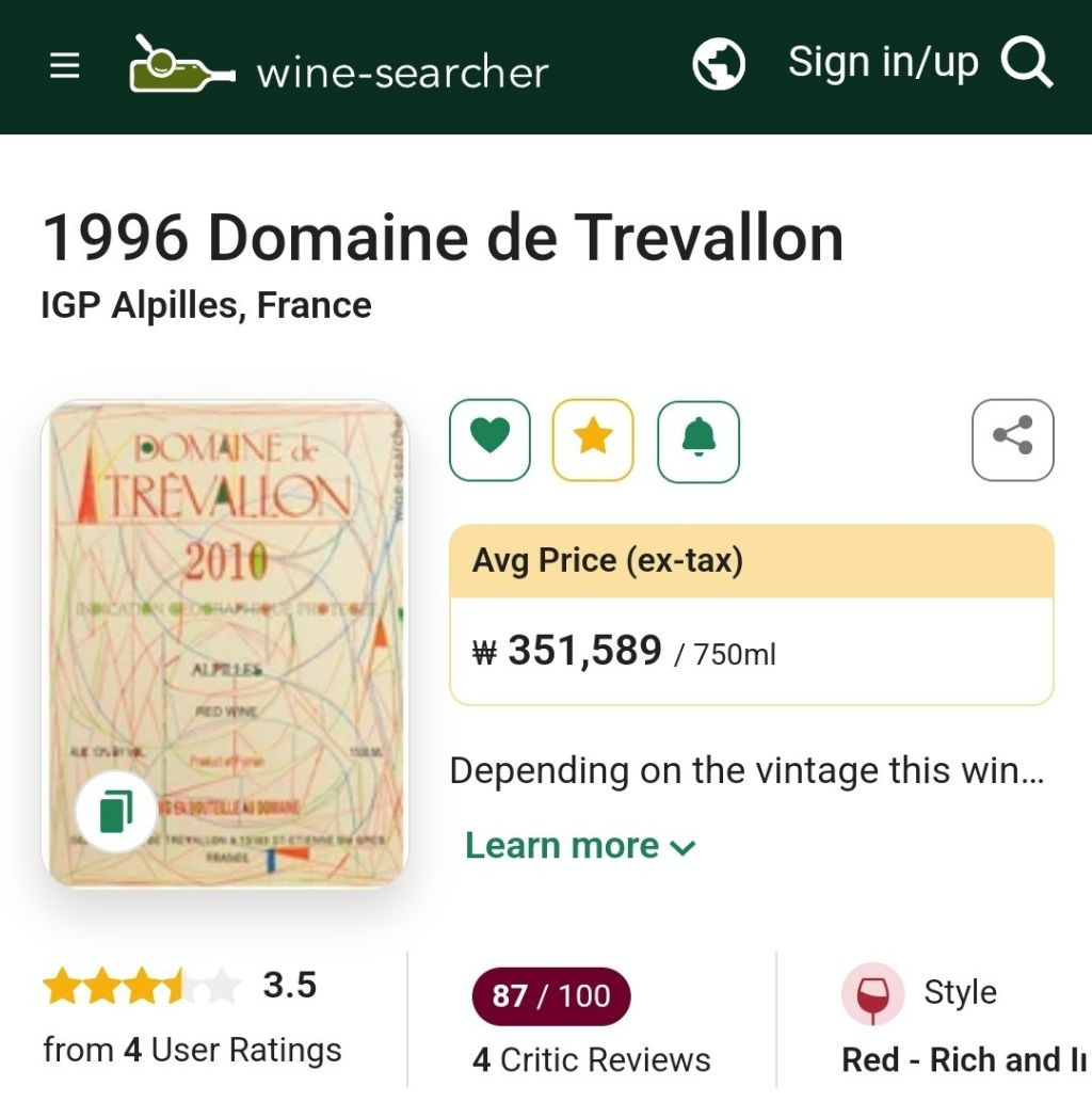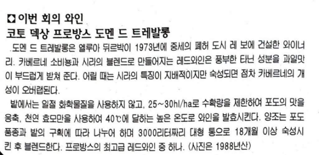 🎬 모임 주제: 프로방스 지방의 강자이자 프랑스 와인역사에서 까베르네 소비뇽과 쉬라의 '반반 블렌딩'을 과감하게 개척한 남프랑스의 슈퍼 투스칸, '도멘 드 트레발롱 루즈 1996빈' 한병 준비해서 같이 마셔보고자 합니다. 참고로 1996빈은 <전설의 100대 와인>에 수록되어 있는 트레발롱의 빈티지와 동일합니다.
