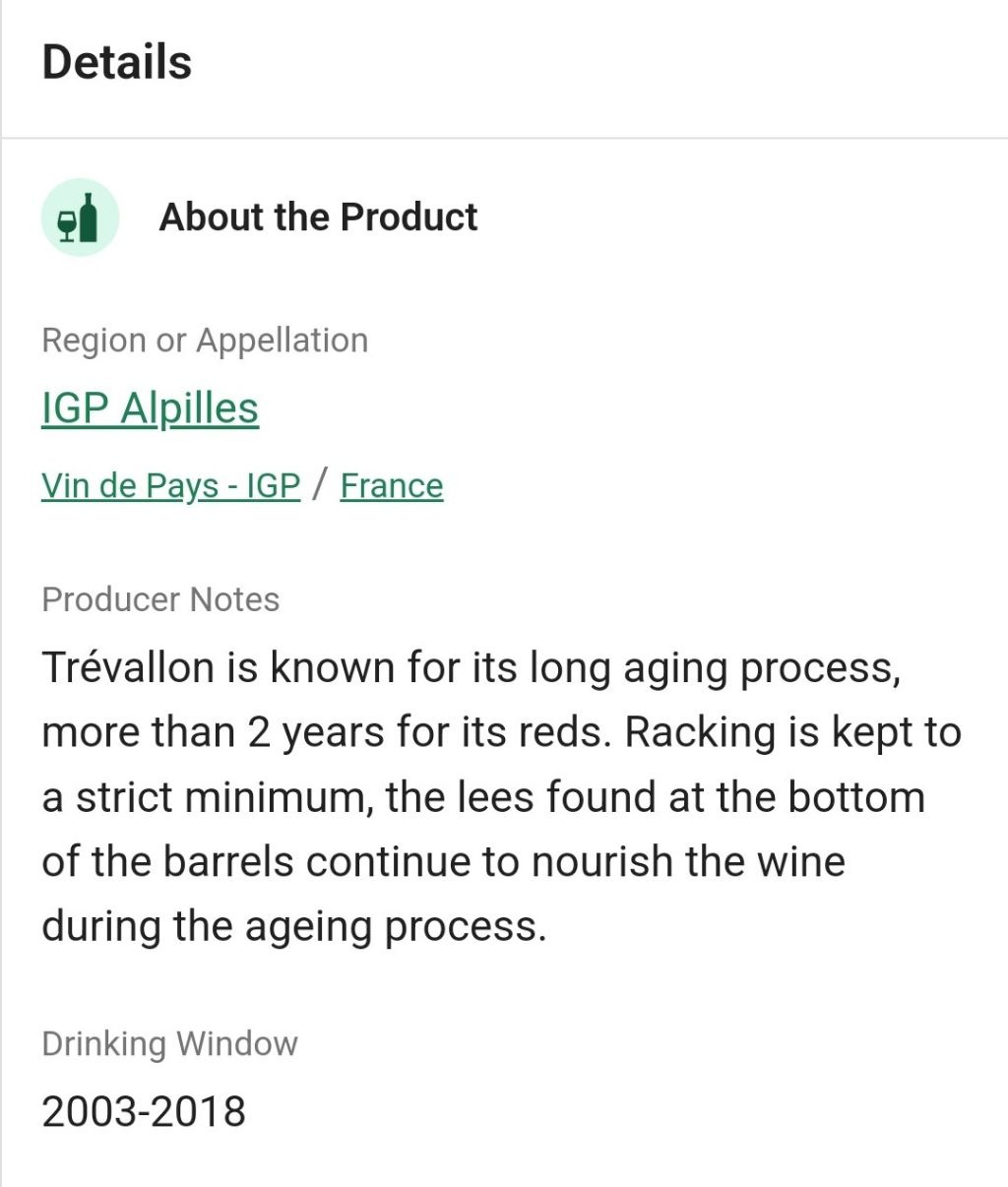 현재 와인은 카베르네와 쉬라를 50 : 50으로 사용한다. 2001 빈티지는 미스트랄(Mistral, 프랑스 등지의 지중해 연안에 부는 찬 북서풍)의 영향으로 포도가 말라버려 수확량이 적고 농도가 진했다. 그 결과 와인은 황홀한 색과 즙을 가질 수 있었다. 블랙 커런트와 딸기 향을 풍기고 토바코와 허브 향이 살짝 감돌며 또렷한 미네랄 풍미를 느낄 수 있다.