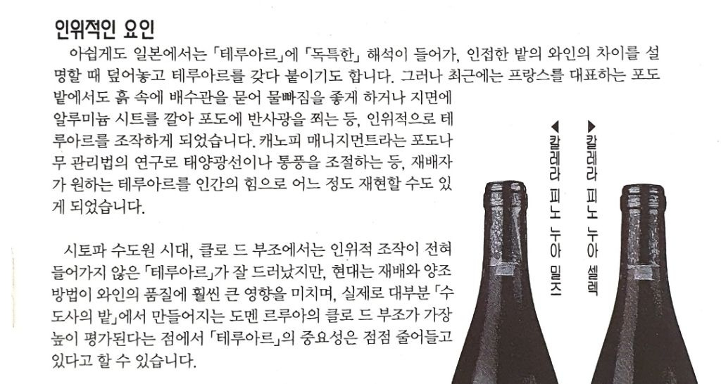 아쉽게도 일본에서는 [테루아르]에 독특한 해석이 들어가, 인접한 밭의 와인의 차이를 설명할 때 덮어놓고 테루아르를 갖다 붙이기도 함니다. 그러나 최근에는 프랑스를 대표하는 포도밭에서도 흙 속에 배수관을 묻어 물빠짐을 좋게 하거나 지면에 알루미늄 시트를 깔아 포도에 반사광을 죄는 등, 인위적으로 테루아르를 조작하게 되었습니다. 캐노피 매니지먼트라는 포도나