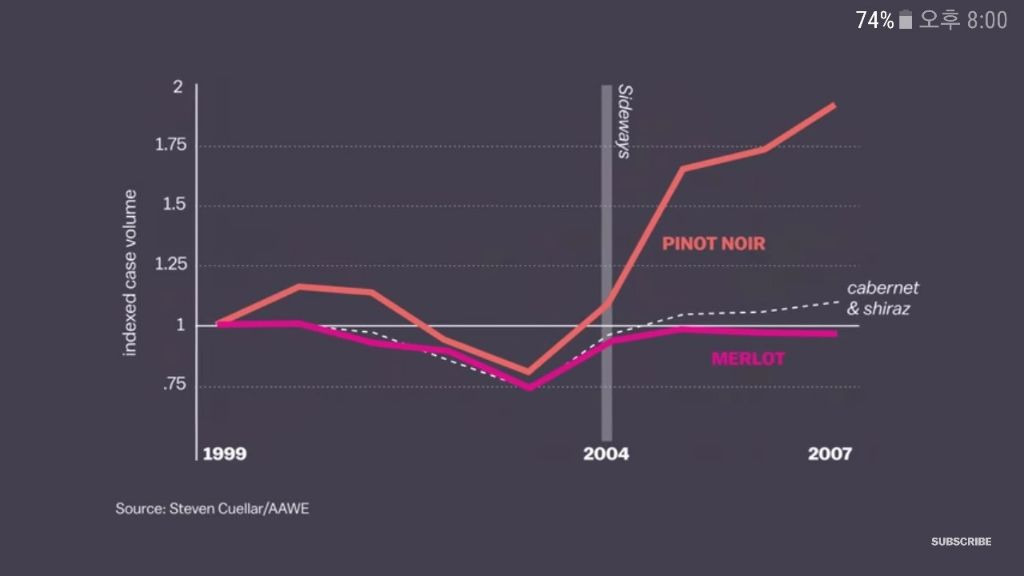 (자료에 의하면) 영화 속에서 주인공 마일즈가 극찬한 피노는 2004년 이후 판매량 급증, 같은 증가세를 기록한 카버네 소비뇽과 쉬라즈의 판매량을 압도함