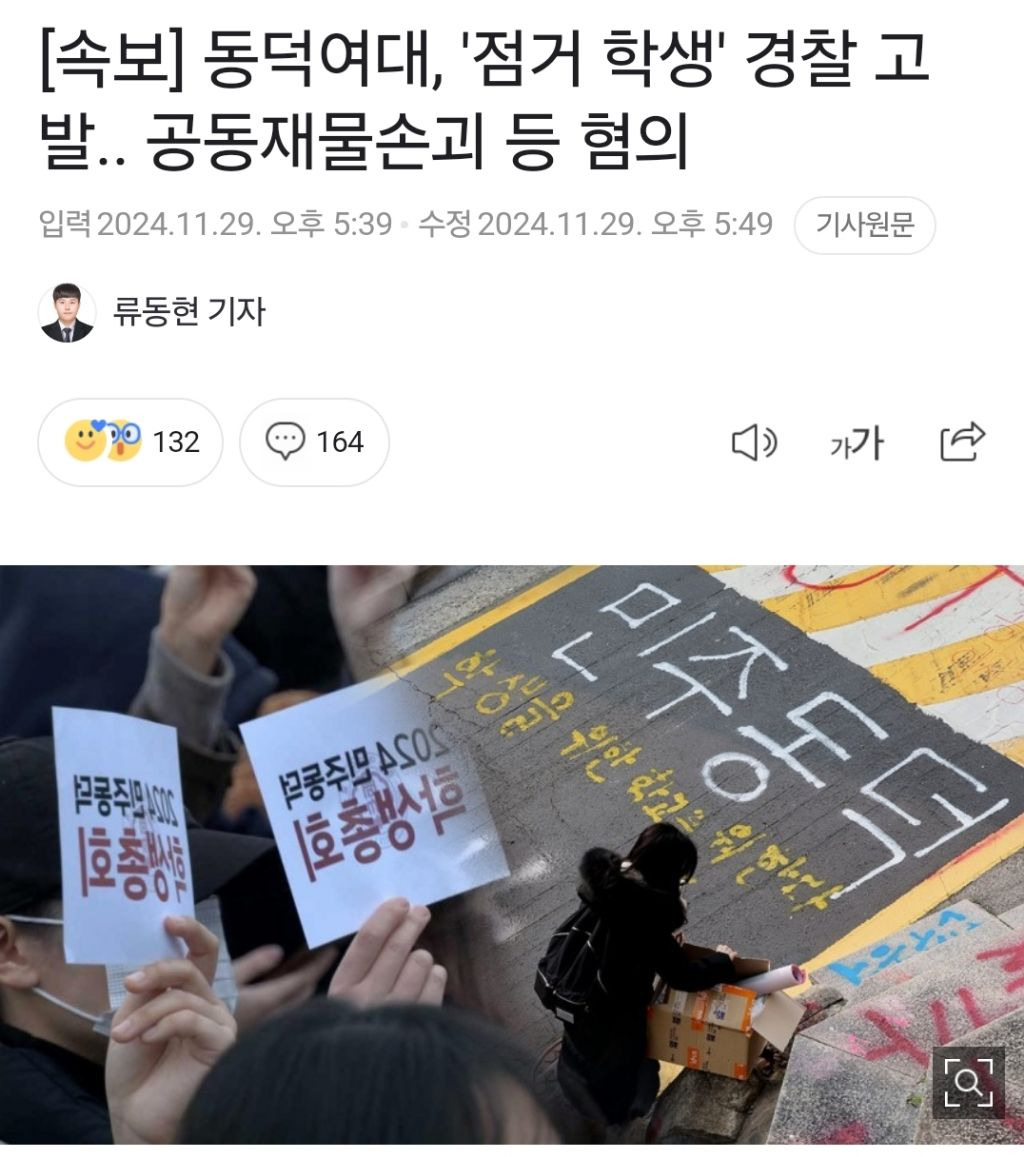 [기사] [속보] 동덕여대, 본관 점거 학생들 경찰 고발.. 공동재물손괴 등 혐의