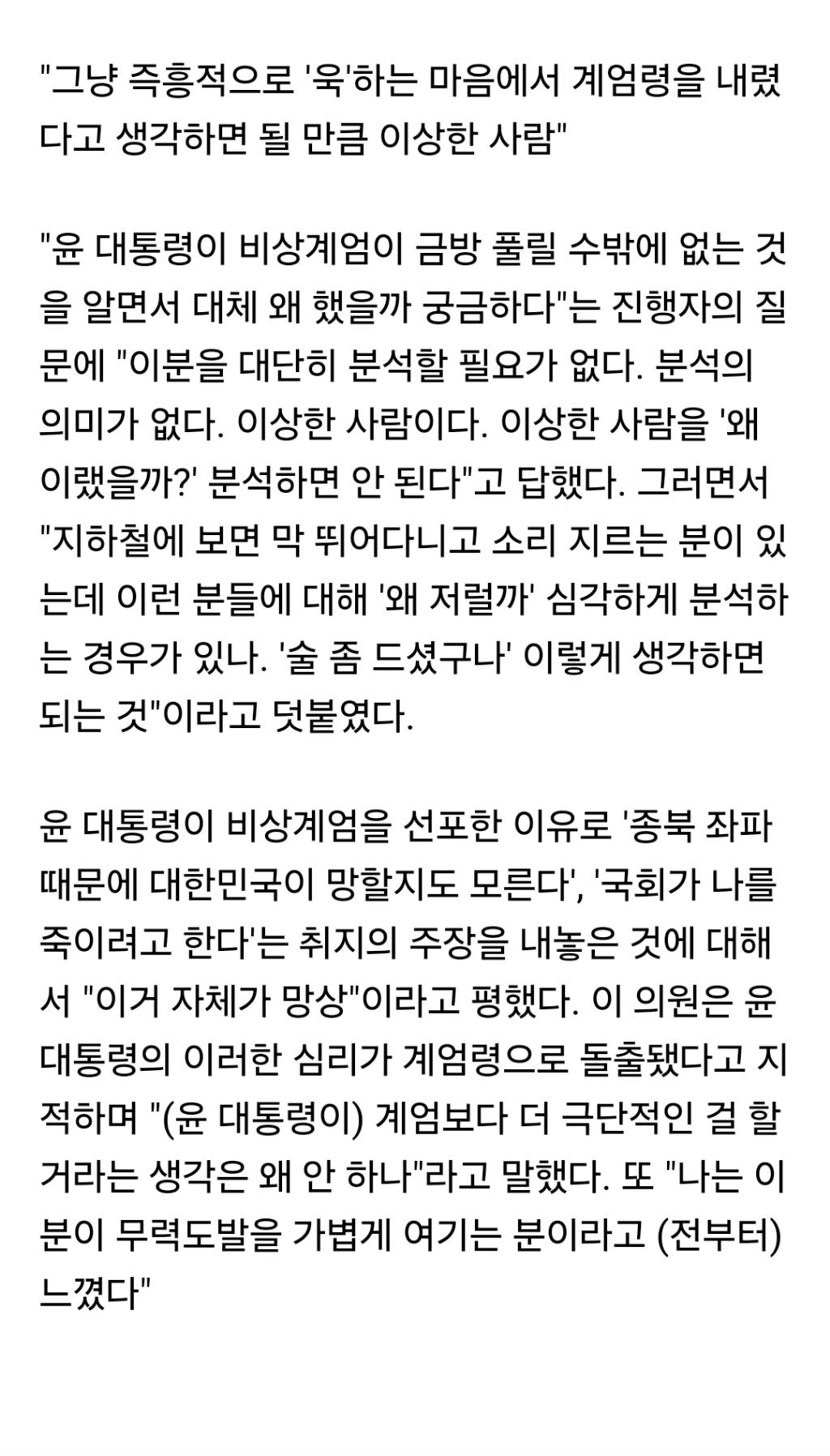 이준석 개혁신당 의원이 윤석열 대통령의 비상계엄령 선포 이유를 분석할 필요가 없다고 주장하면서 "그냥 즉흥적으로 '욱'하는 마음에서 계엄령을 내렸다고 생각하면 될 만큼 이상한 사람"이