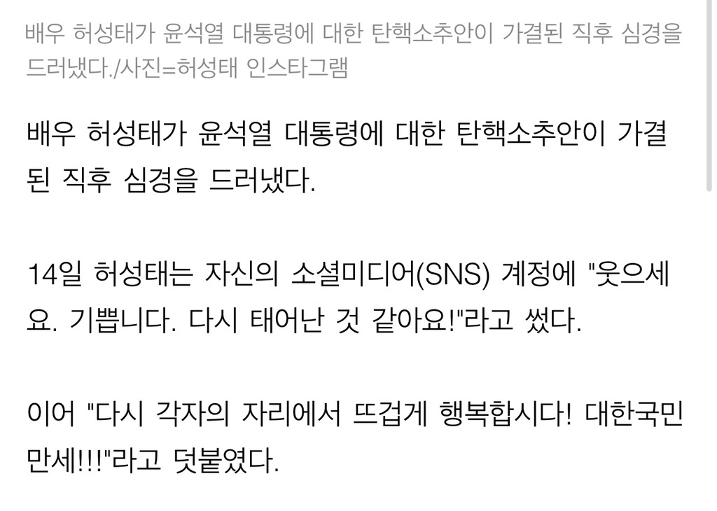 허성태, 尹 탄핵 가결되자 "다시 태어난 것 같다. 대한국민 만세"