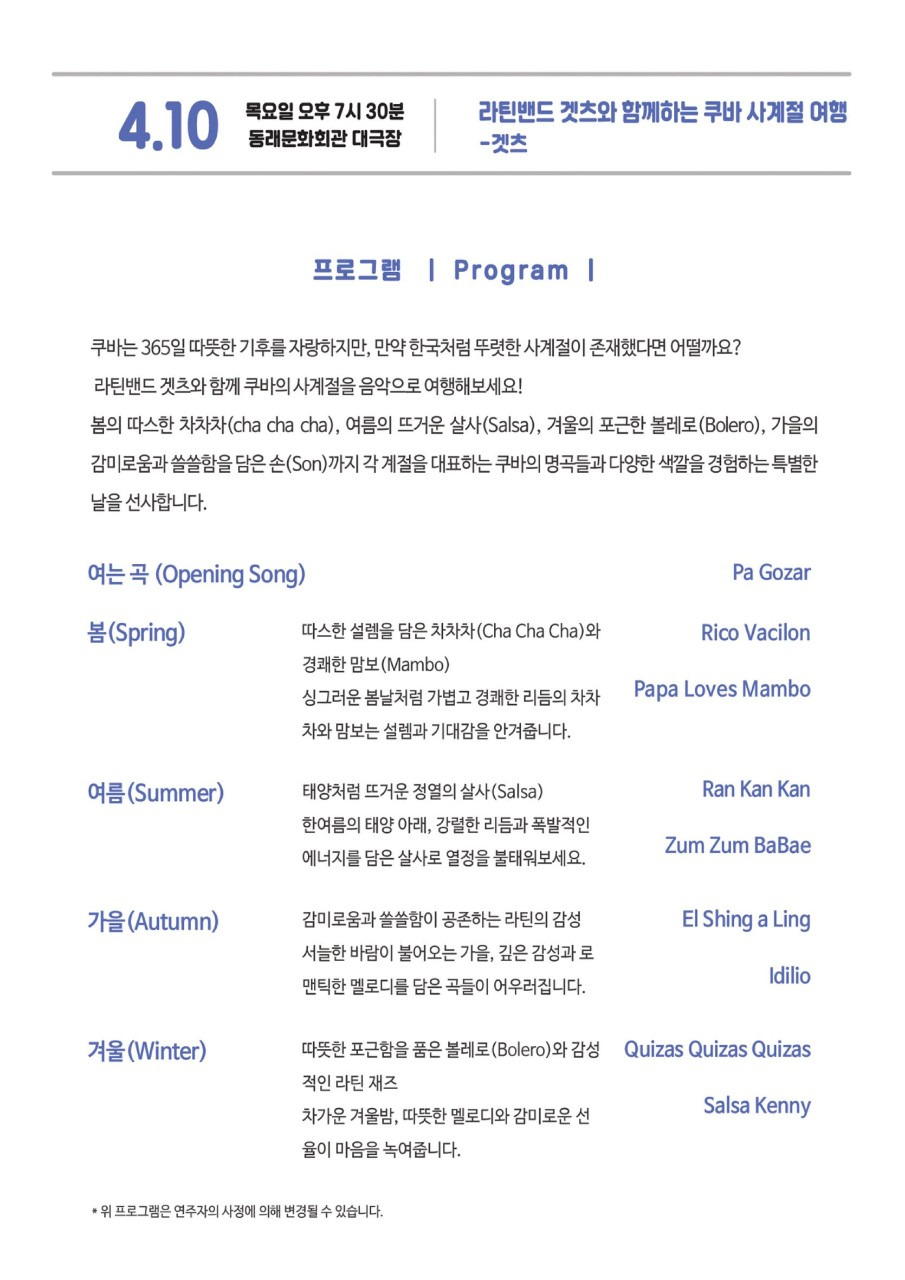 목요상설 음악회 아트살롱 "라틴밴드 겟츠와 함께하는 쿠바 사계절 여행" 관람 + 와인 byob 번개