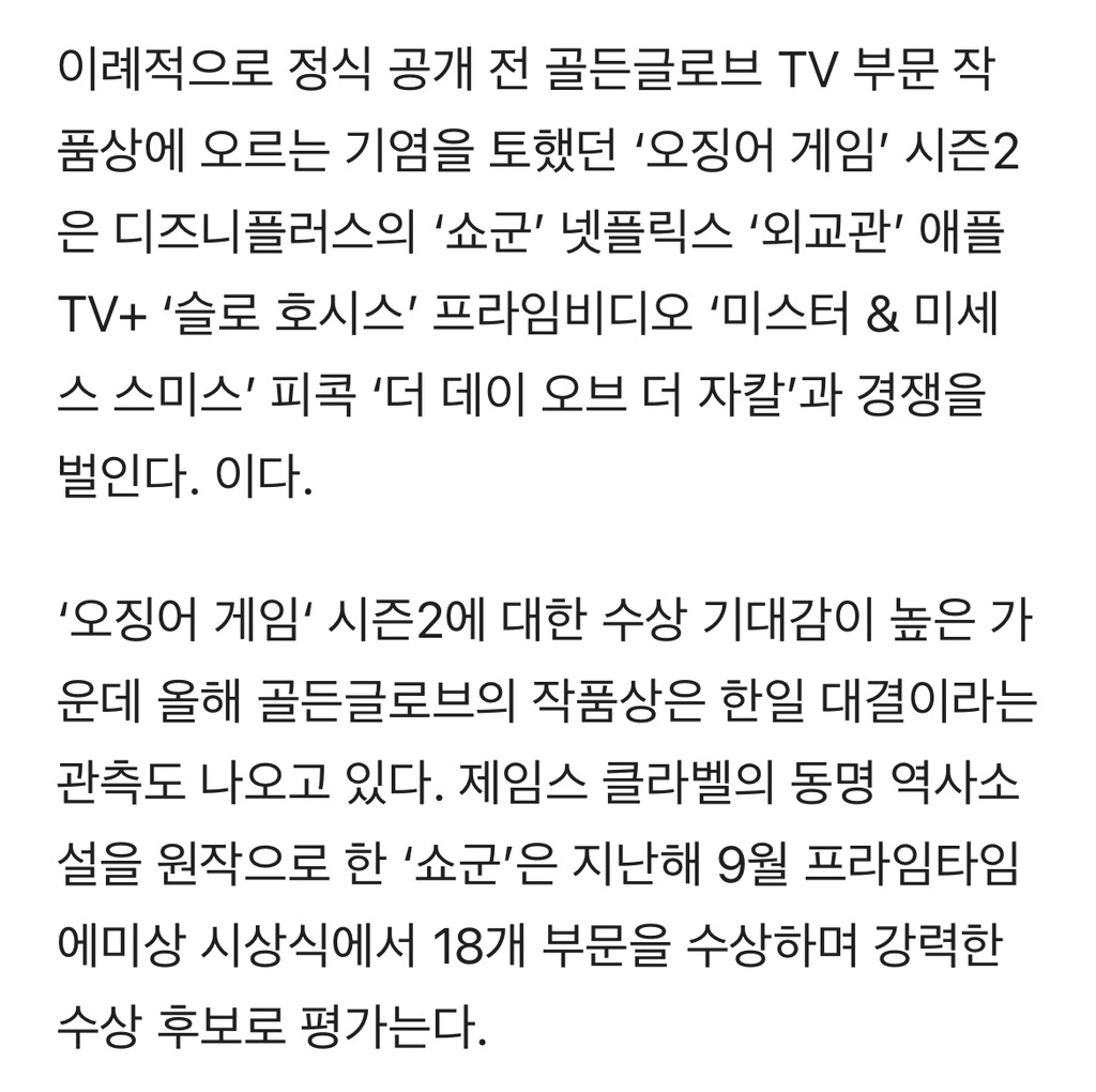 넷플릭스 시리즈 ‘오징어 게임’ 시즌 2가 미국 골든글로브 수상에 도전한다. ‘오징어 게임’ 시즌2는 골든글러브의 트로피를 거머쥘 수 있을까. ‘오징어 게임’ 시즌2의 주역인 황동혁 감독