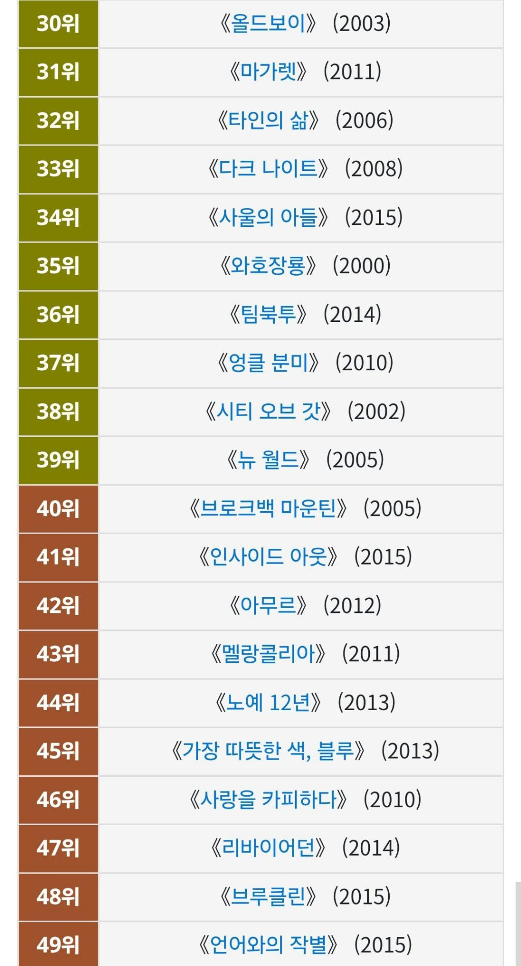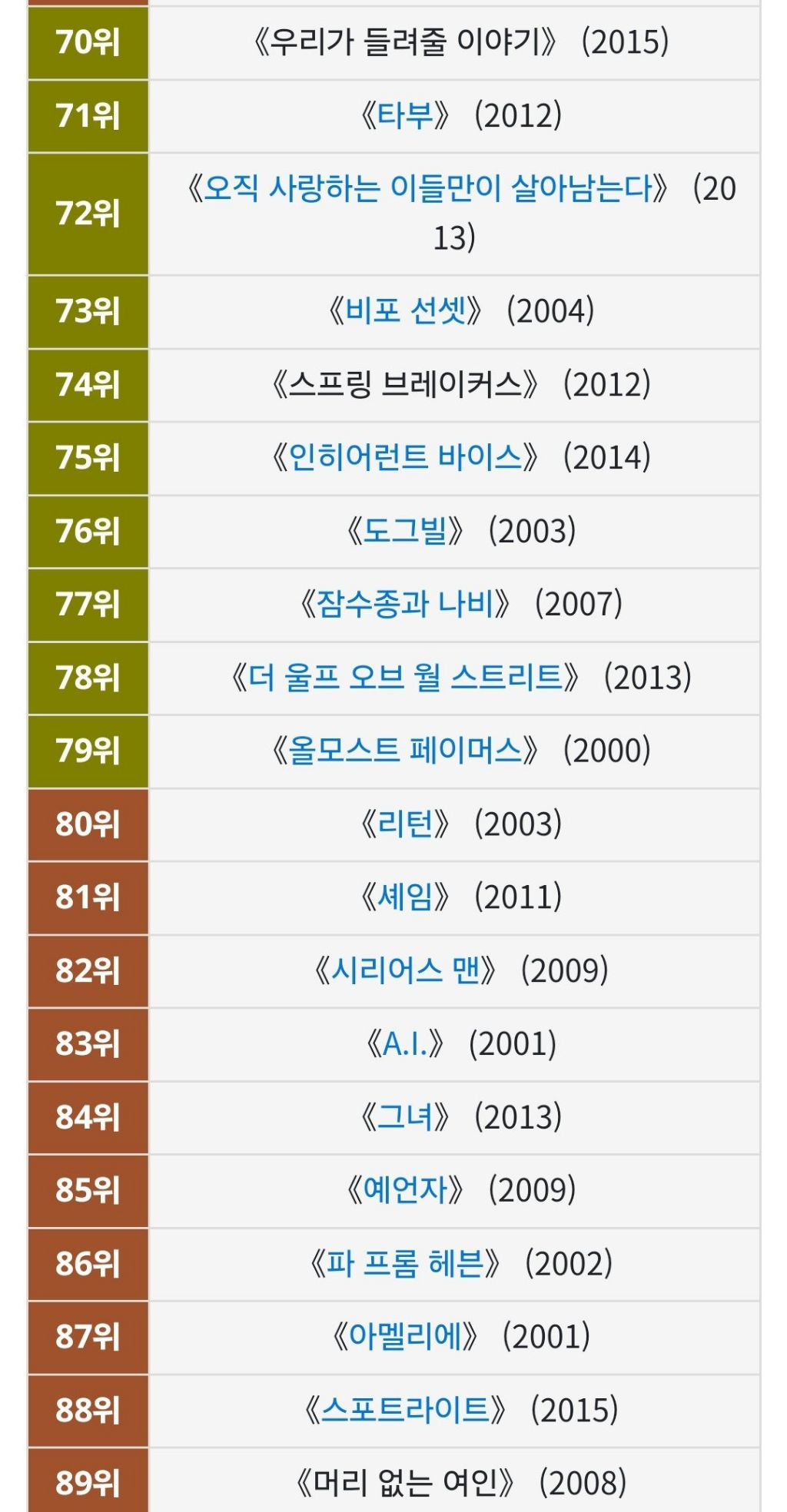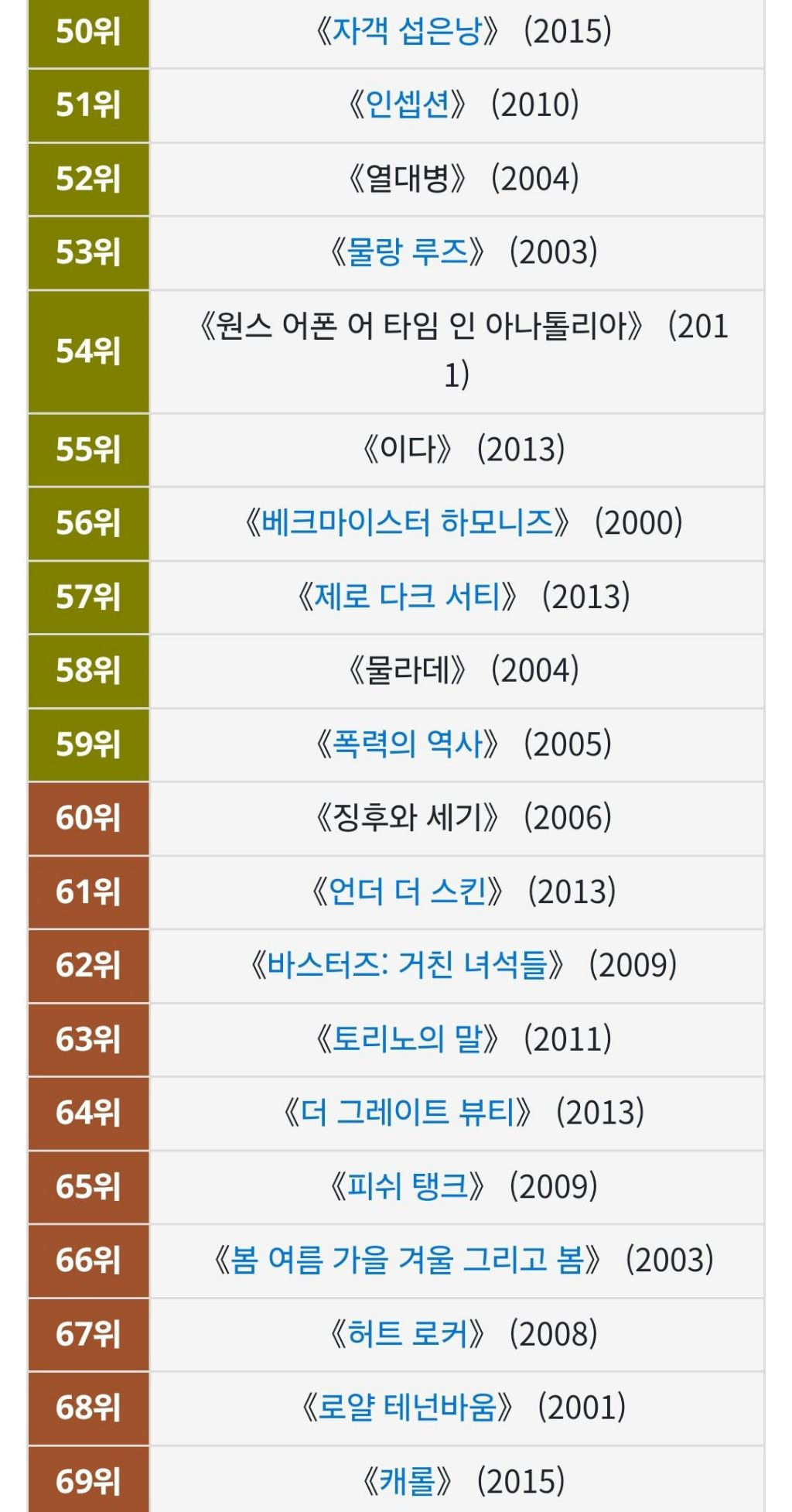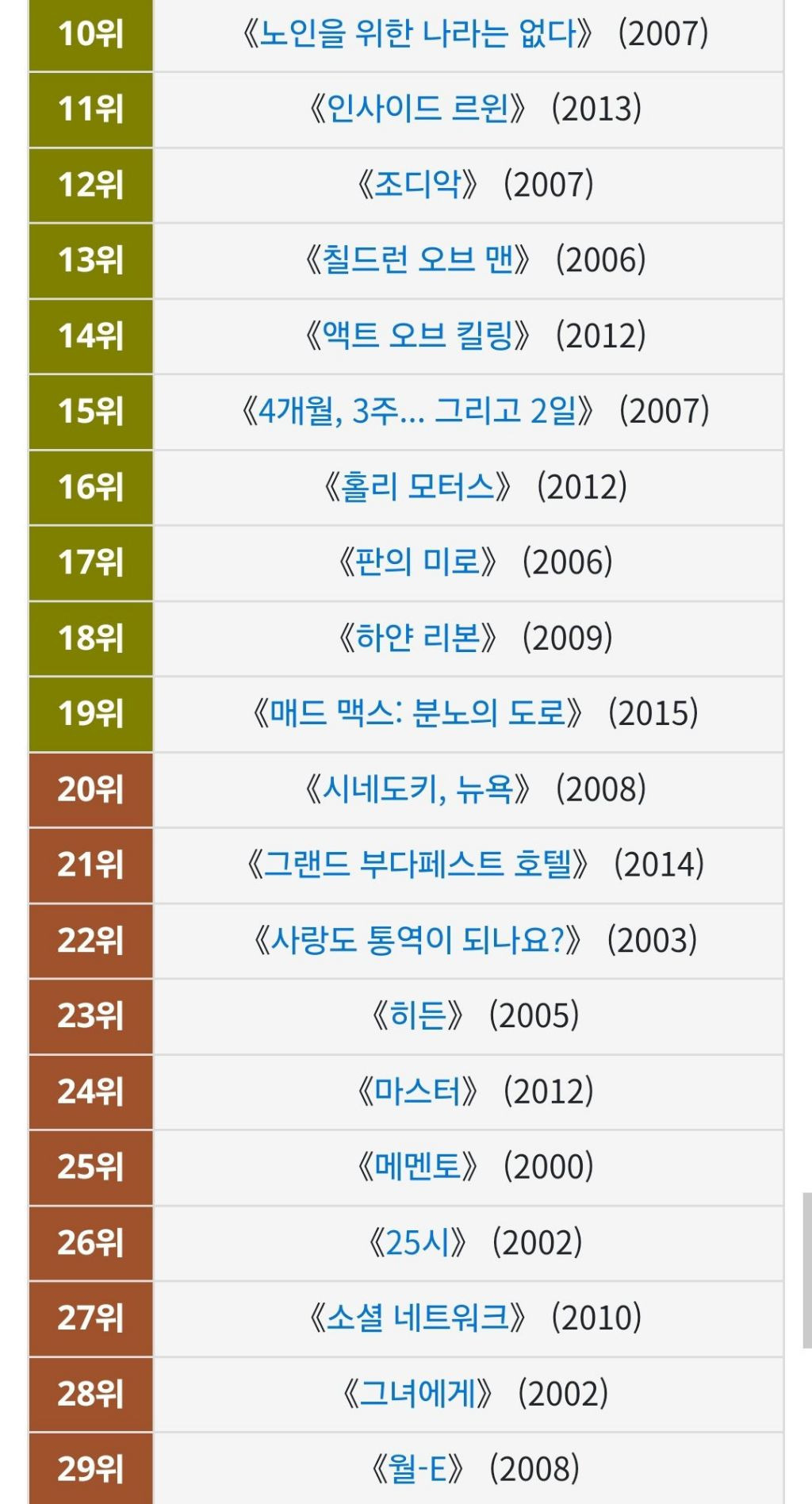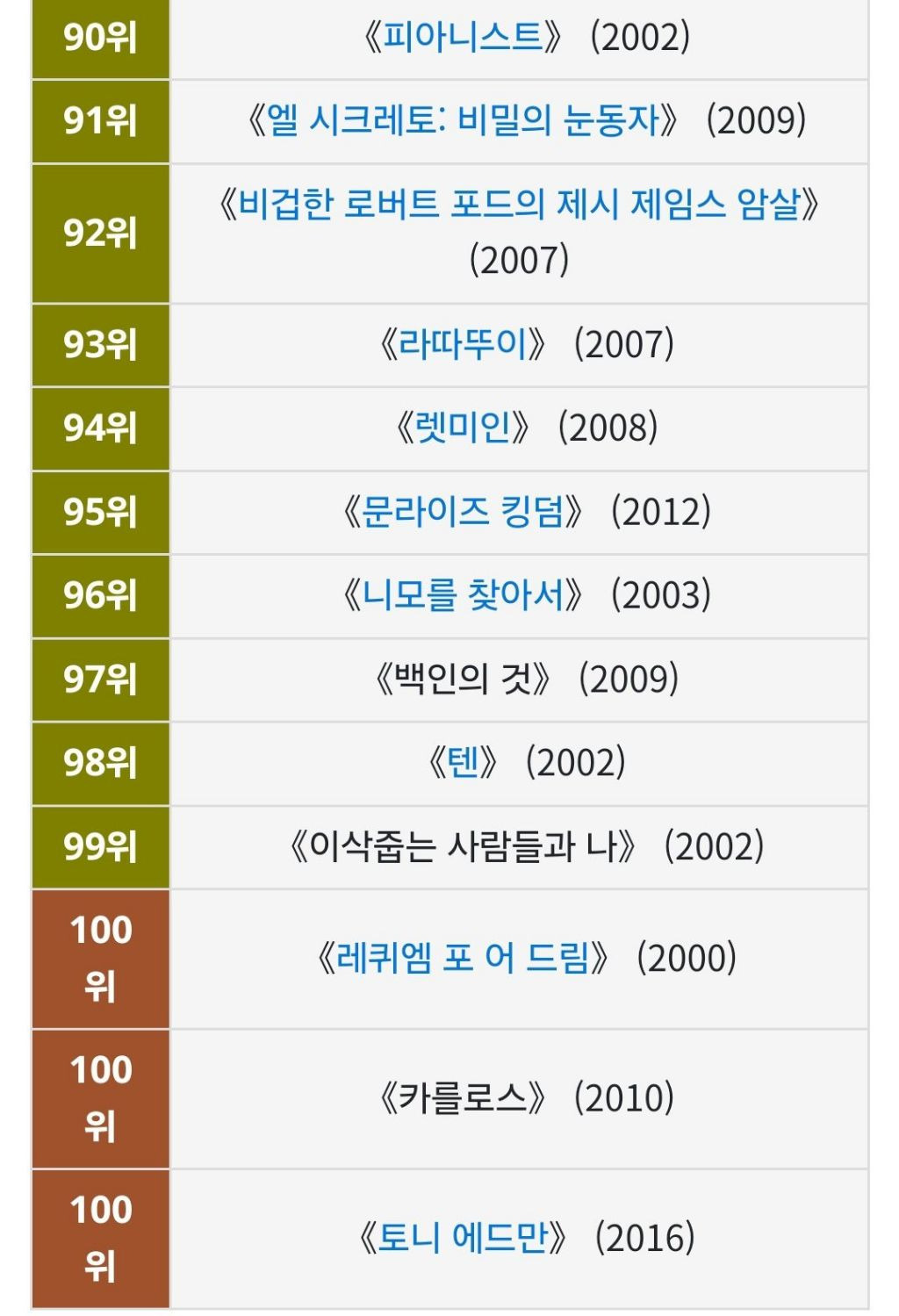 [영화] BBC 선정 '21세기 위대한 영화 100편'