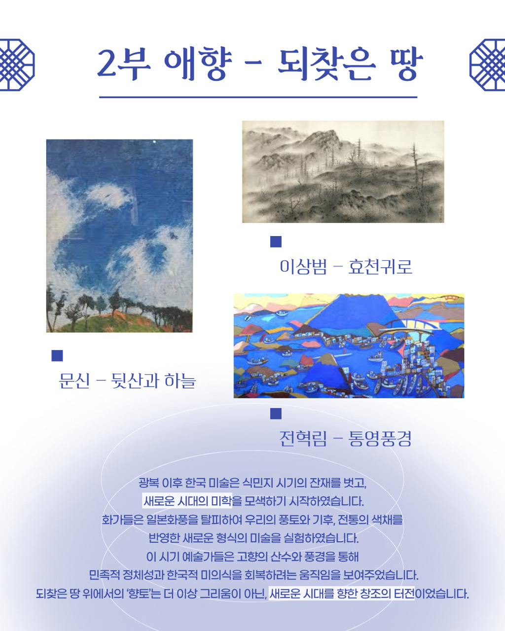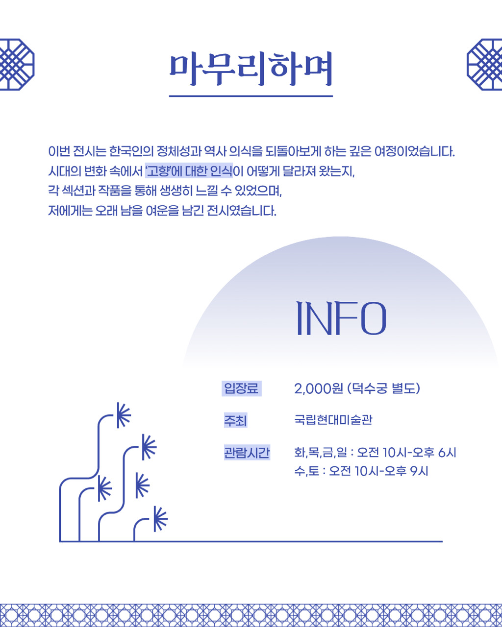 고향의 기억과 그리움을 따라가는 시간.🎨 ‘향수, 고향을 그리다’📍 국립현대미술관 덕수궁🗓 2025.8.14 – 11.9일제강점기부터 오늘까지,한국인이 품어온 ‘고향’의 감정을 네 가지 시선으로 만나보세요.#국립현대미술관 #덕수궁 #광복절 #광복80년 #전시추천
