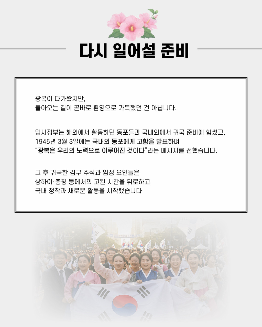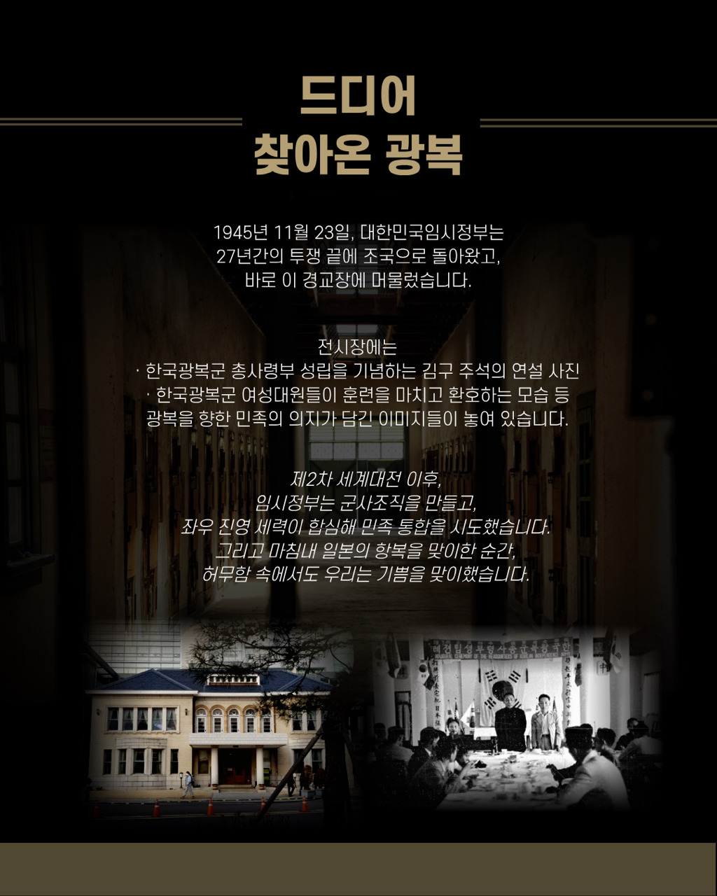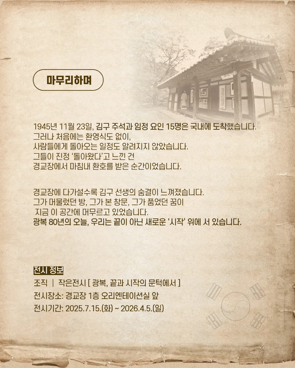 🇰🇷 광복, 끝과 시작의 문턱에서27년의 망명 끝, 임시정부가 조국으로 돌아온 그날.경교장의 문턱에서 끝이자 새로운 시작이 된 역사의 숨결이 되살아납니다.김구 선생의 마지막 숨결이 서린 공간,그 문 앞에서 우리는 다시 묻습니다.광복이란 무엇이었고, 우리는 지금 어떤 시작 위에 서 있는가.📍 경교장 1층 오리엔테이션실 앞🗓 2025.7.15 – 2026.4.5