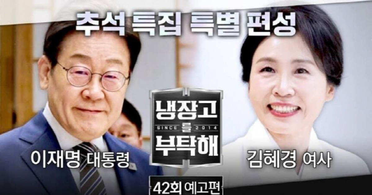 [스포츠조선 조민정 기자] 이재명 대통령 부부가 출연하는 JTBC '냉장고를 부탁해' 추석 특집 방송이 하루 연기됐다. 지난 4일 JTBC 측은 "5일 예정됐던 '냉장고를 부탁해' 추석 특집은 6일 월요일 밤