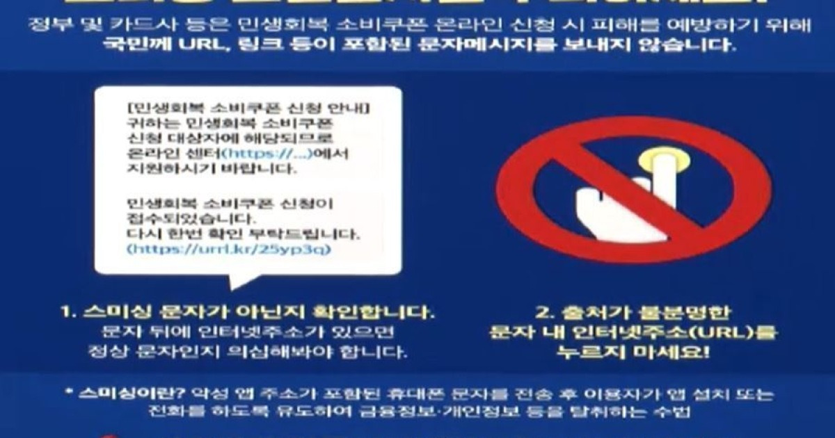 정부는 민생회복 소비쿠폰 문자에 URL을 포함하지 않는다. 스미싱 의심 문자는 클릭하지 말고 삭제하며, 피해 시 118 상담센터에 신고한다.