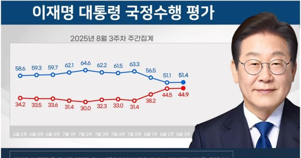 이재명 대통령의 국정수행 지지율이 3주 만에 반등하며 51.4%를 기록했다. 민주당 지지율은 45.8%로 국민의힘을 오차범위 밖에서 앞섰다.
