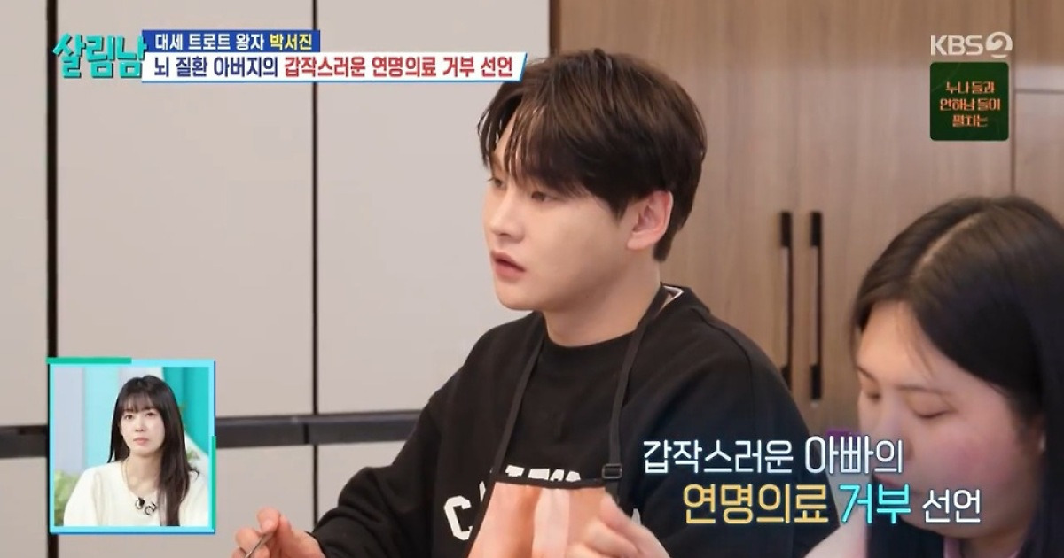 가수 박서진이 아버지의 연명 치료 거부 선언에 큰 충격을 받았다. 11월 29일 방송된 KBS 2TV ‘살림하는 남자들 시즌2’(약칭 ‘살림남’)에서는 박서진이 그동안 눌러왔던 감정을 터트리는 모습