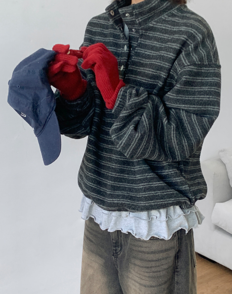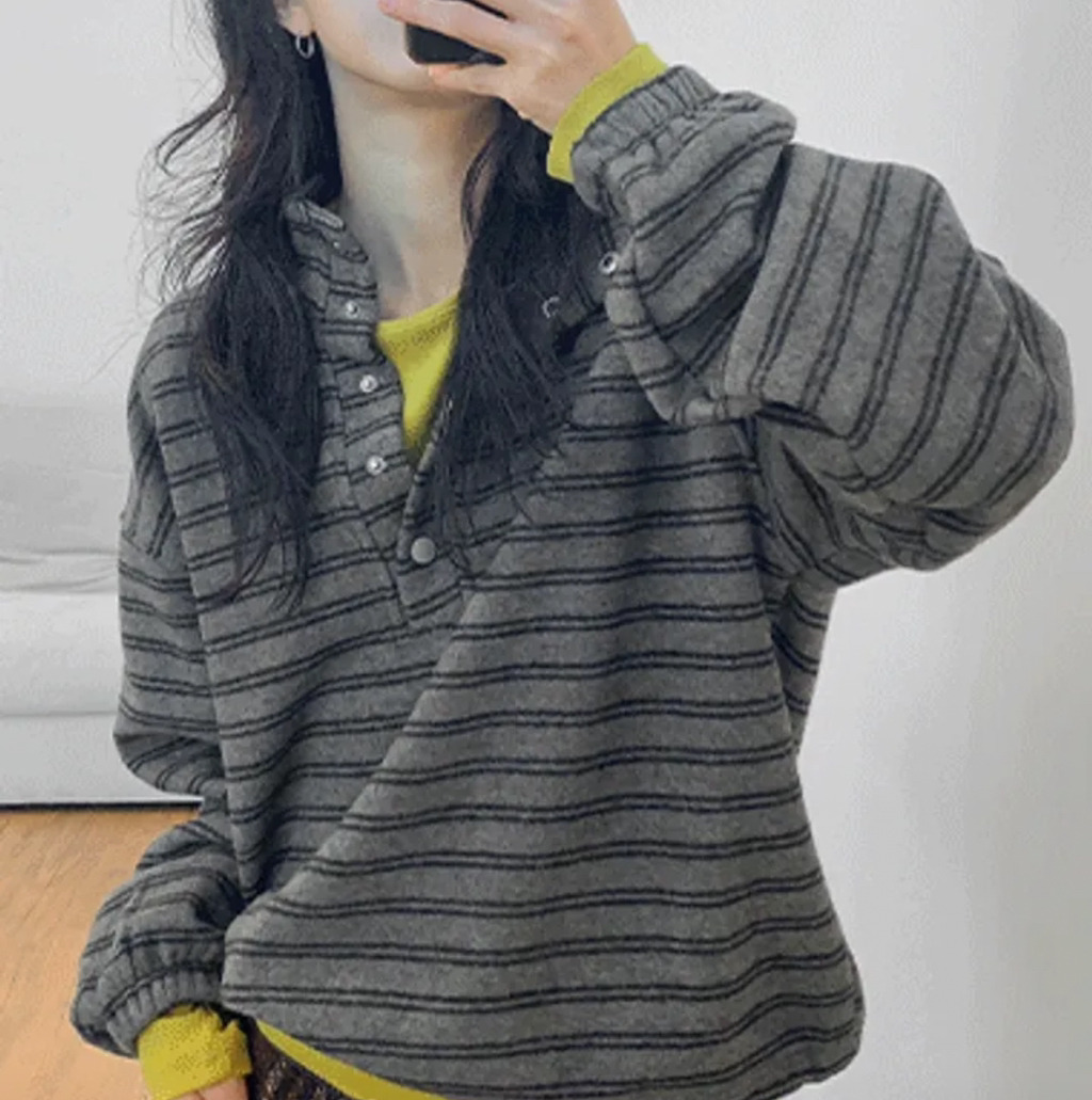 무지도 있는데 개인적으로 스트라이프 색감이 진짜 귀여운듯 ! 리뷰도 좋고 낙낙해서 외투안에 레이어드해서 입으면 좋을 것 같아요 ! 낙낙해서 셔츠나 폴라티랑 입어도 편할 듯 !