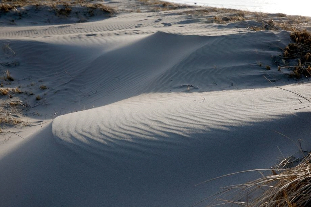 따라서 북서 계절풍을 직접적으로 강하게 받는 지역으로 북서계절풍에 의해 주변 산지의 운모편암이 깎여 바다로 들어간 뒤 파랑을 타고 다시 바닷가로 밀려들거나