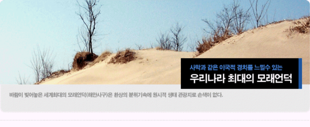 바람이 빚어놓은 세계최대의 모래언덕(해안사구)은 환상의 분위기속에 원시적 생태 관광지로 손색이 없다.