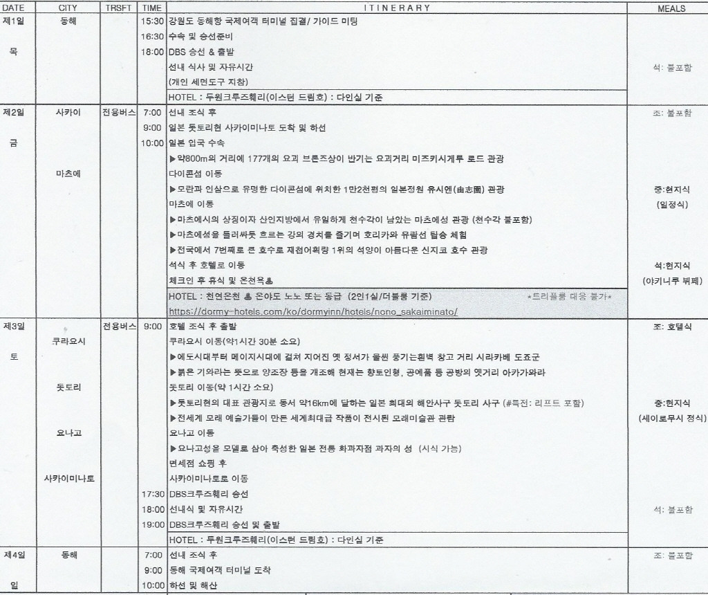 가이드 기사 경비(성인,소아 동일 1인당 ¥4천)특전사항돗토리 사구 리프트 포함비고☞ 노노호텔 트윈/트리플 룸 이용시 1박당 3천엔 추가,싱글룸 이용시 1인 1박당 8천엔 추가