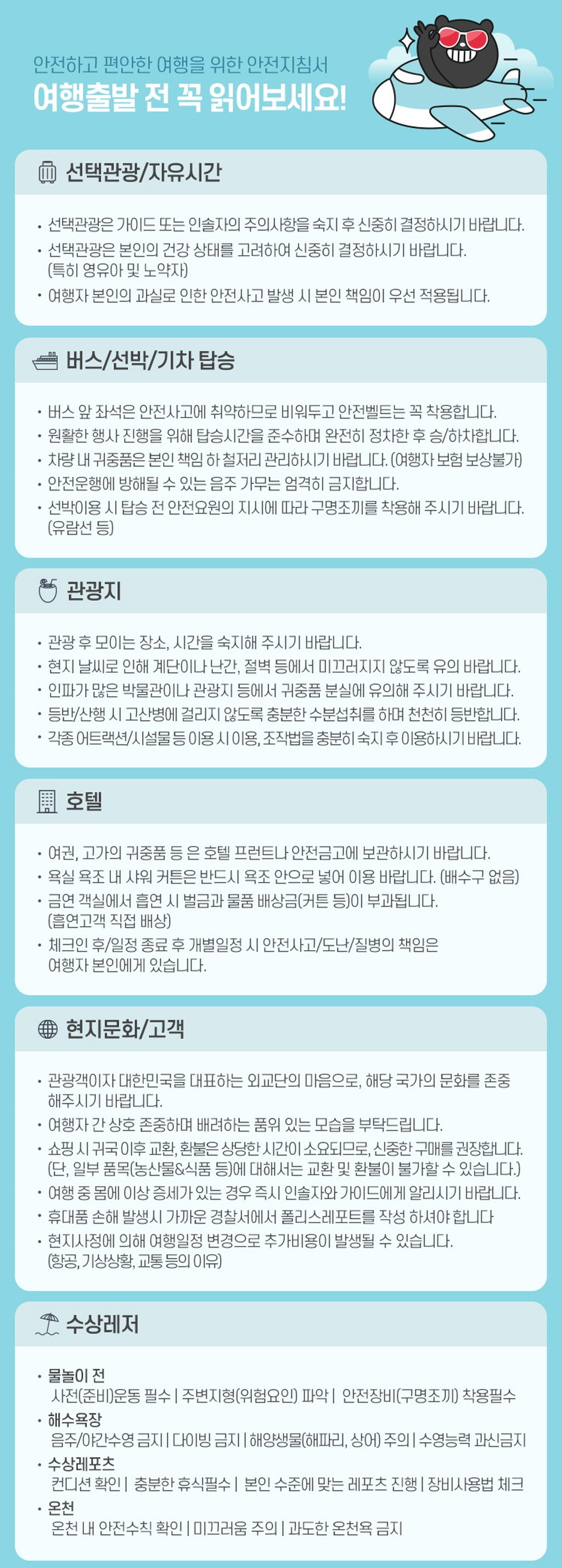 6.출발 2~3일전에 준비물,미팅장소 등을 게시합니다. 유류할증료의 경우 상품가 입금시 같이 입금 부탁드립니다.[포함]