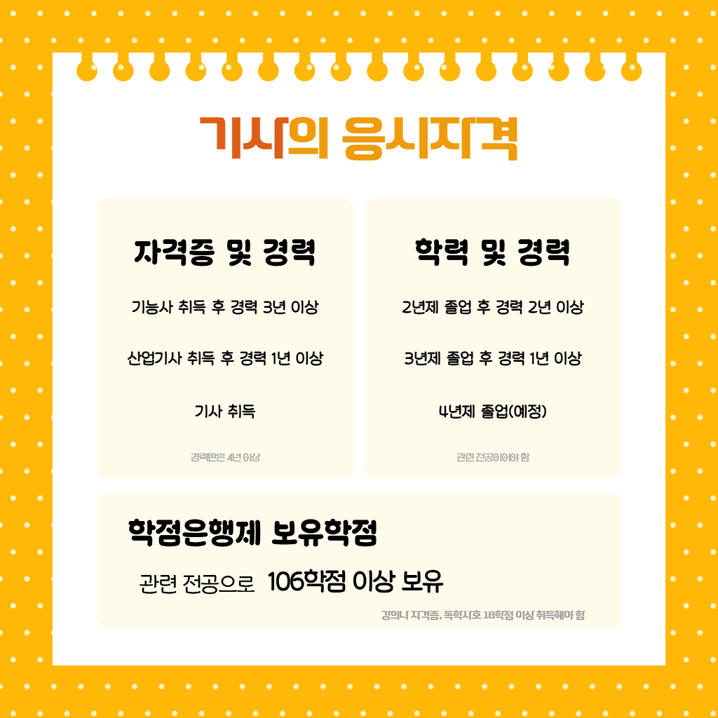 자격을 갖추는 방법은 크게 학력 요건, 경력 요건, 산업기사 취득 후 경력, 그리고 학점이수제도 활용으로 나눌 수 있어요. 아래 내용을 잘 읽어보시면 내가 어디에 해당되는지 알 수 있을 거예요.