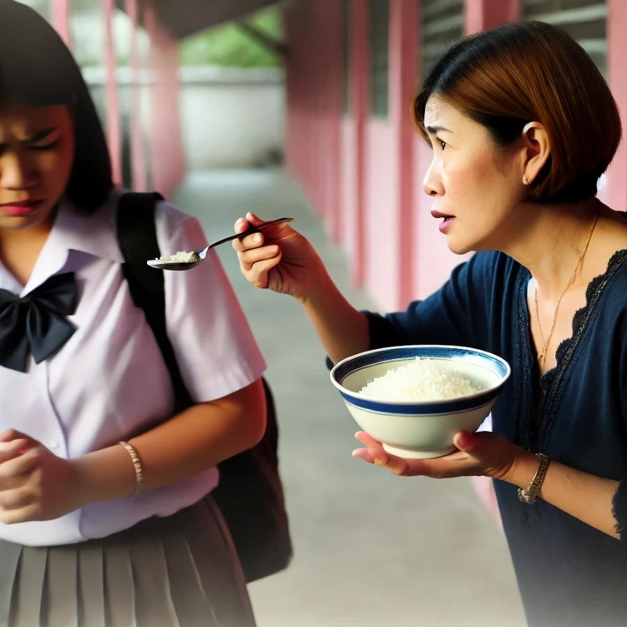 어머니는 밥그릇하나와 숟가락을 들고 딸에게 조금이라도 먹이려 하고 있었고, 딸은 바삐 걸음을 재촉하고 있었다.