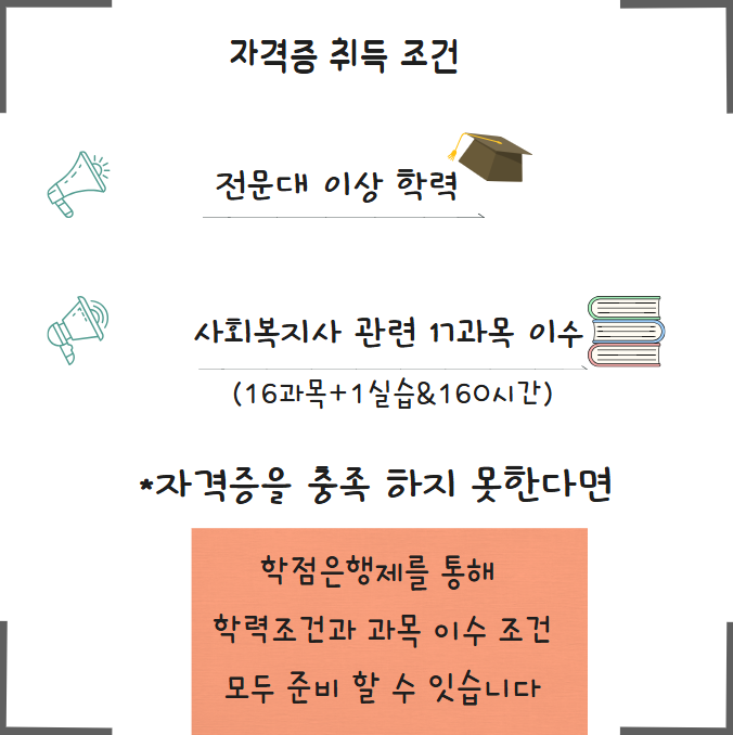 사회복지사 관력 17과목(16과목+1실습-160시간)을 이수 하셔야지