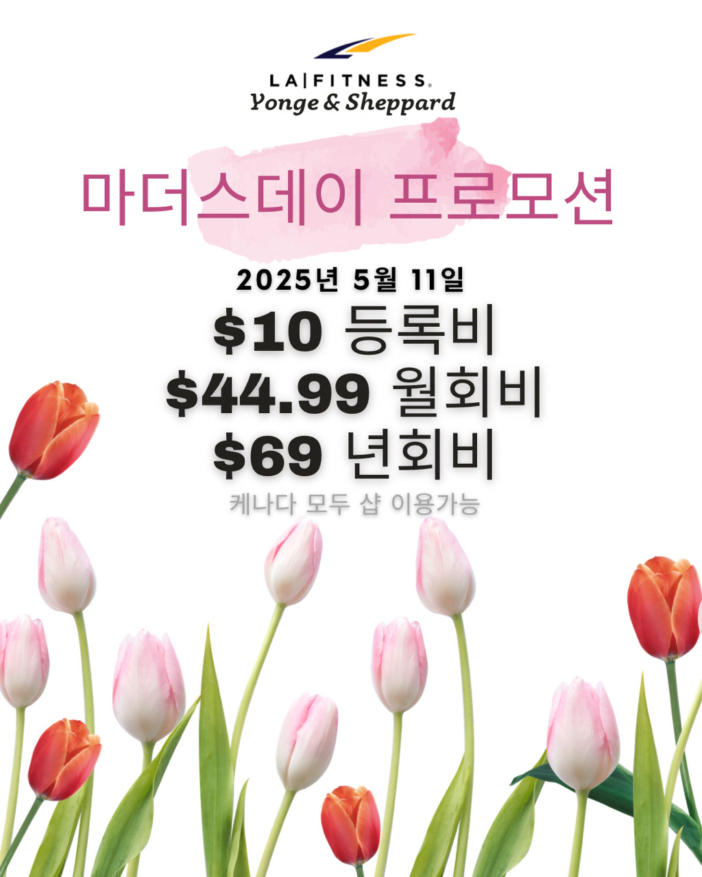 여러분 안녕하세요~LA 피트니스 멤버십 마더스데이 프로모션 나왔습니다. 5월 11일 하루만!! 기회를 놓치지 마세요!!멤버십에 대한 질문을 있으면 카카오톡으로 비비안 에게 연락하세요.
