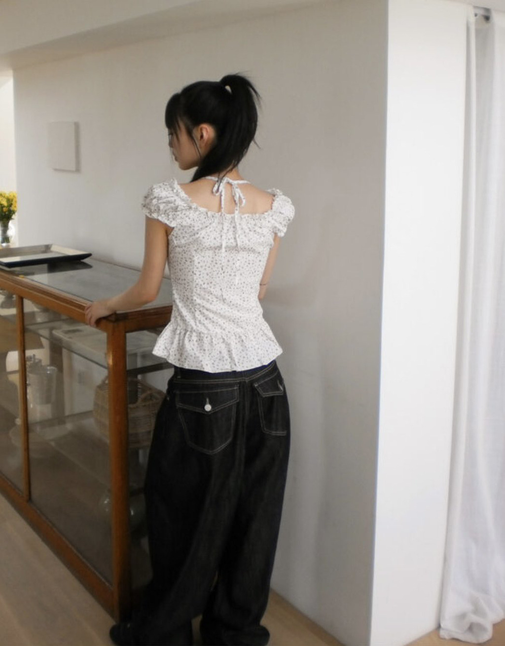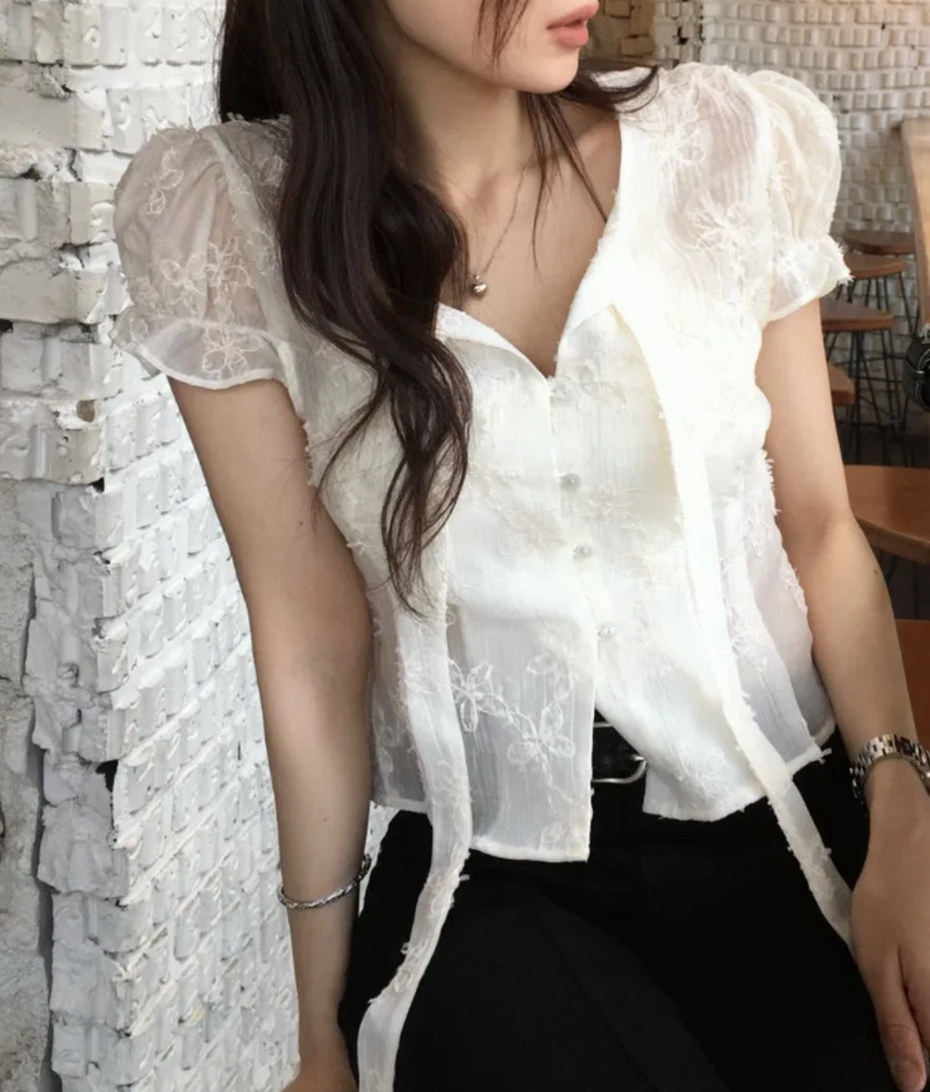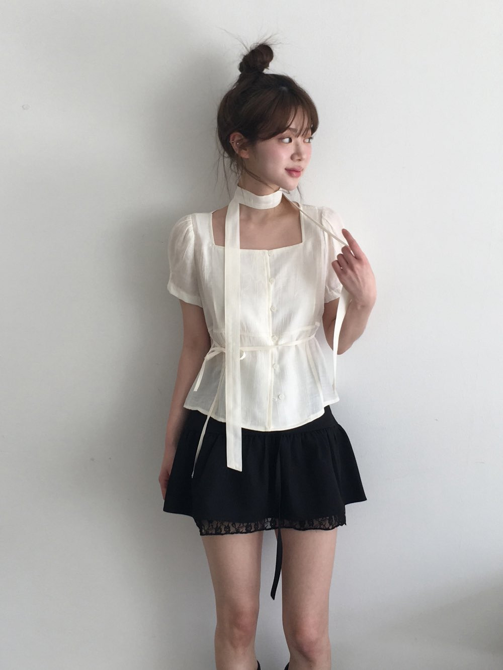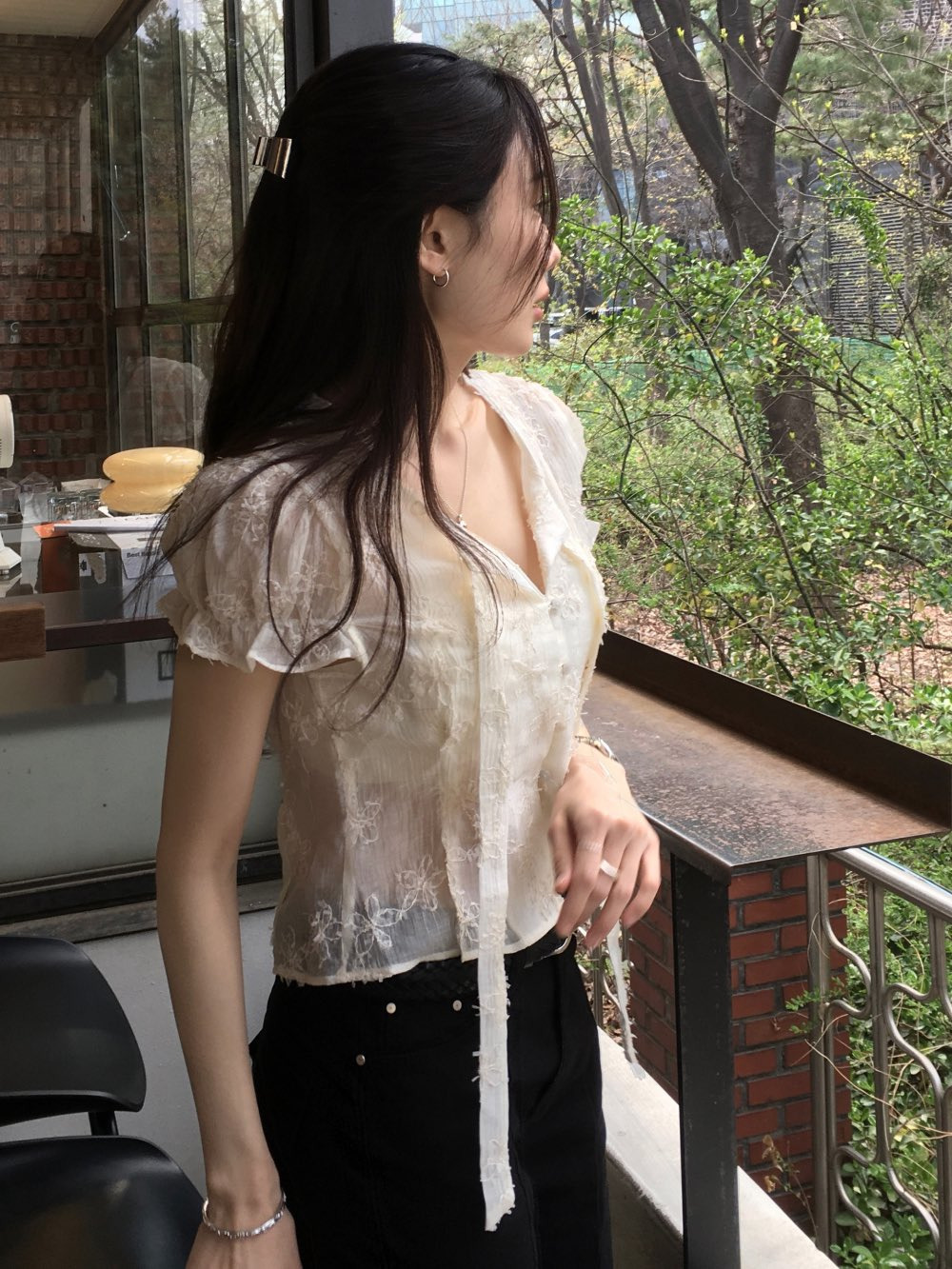 🤍바듀 꽃 스트랩 퍼프 반팔 블라우스