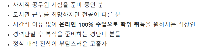 구분가능 여부진행 방식고졸자가능학점은행제로 총 140학점 이수 (약 2년)전문대 졸업자가능최대 120학점까지 인정, 남은 학점만 이수4년제 비전공자가능‘타전공’ 제도로 문헌정보학 전공 48학점만 이수