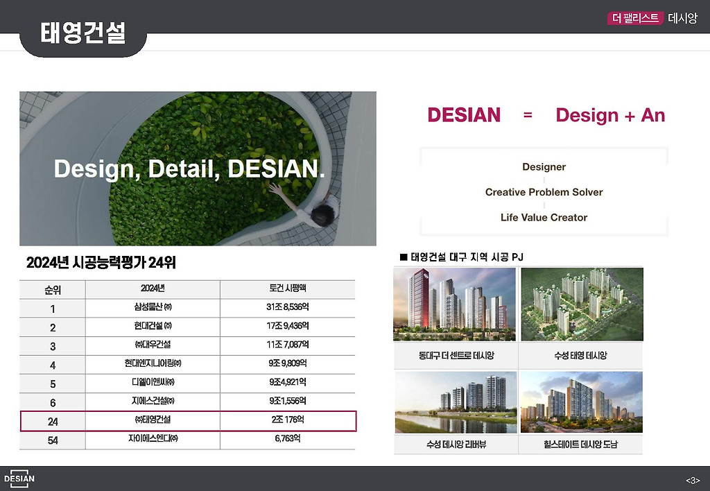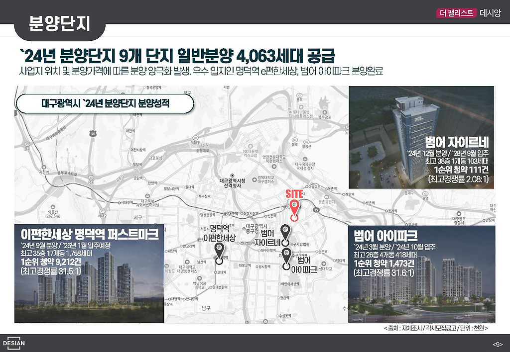 후분양 아파트로 더팰리스트 데시앙은 25년 10월 입주예정 단지입니다. 초여름인 현재 명실상부한 대구광역시 공급 주택 중에서 가장 HOT한 APT - 완판 되기 직전이므로 거주만족과 프리미엄 가치를 누릴 수 있는 마지막 기회를 꼭 놓치지 않기를 권유드립니다.