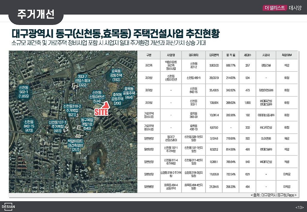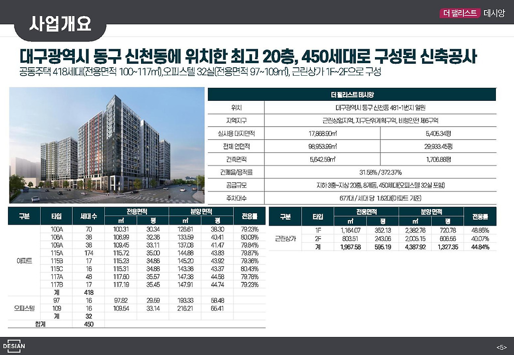 당 현장은 대구광역시 동구 신천동 481번지에 지하3층에서 지상20층, 6개동으로 총 450세대(오피스텔 32실 포함)와 근린강가 1층~2층으로 구성되어 있습니다.