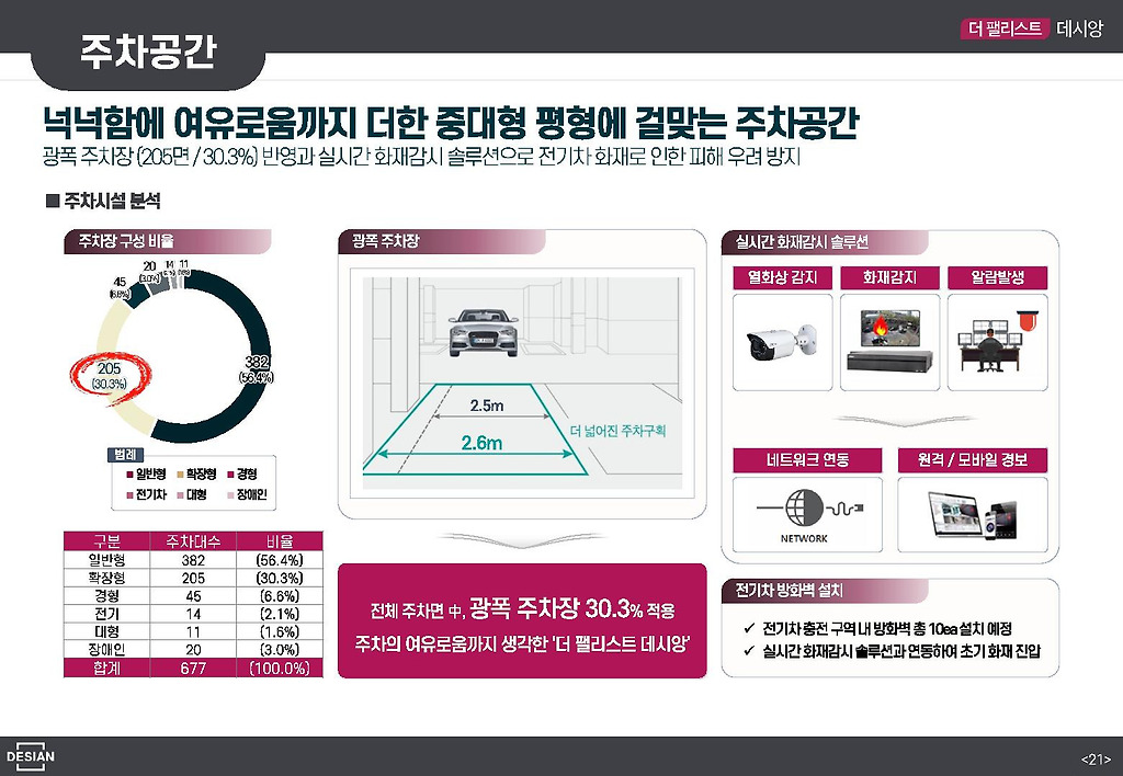 주차대수 677대로 세대당 1.62대(아파트기준)으로 넉넉한 주차공간이 마련되어 주민편의를 제공하고 있습니다.
