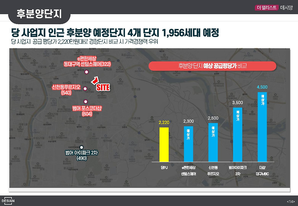 고급 아파트와 오피스텔이 주를 이루는 고급 주거단지로 그 구성은 오피스텔97형(29평), 109형(33평)과 아파트 100형(38평), 106형(40평), 109형(41평), 115형(43평), 117형(44평) 중형 평형대로 구성되어 동구에서 매우 귀한 중형대 공급하는 주거단지로 랜드마크급 입지를 갖추었다고 평가됩니다.
