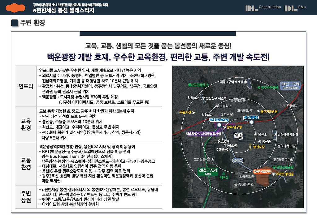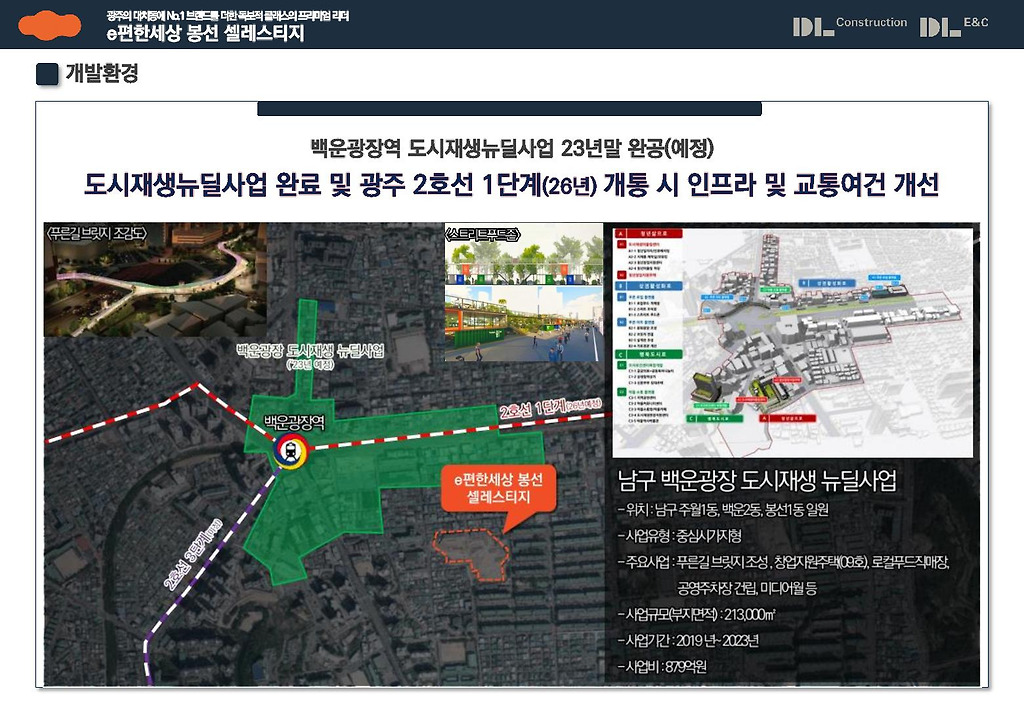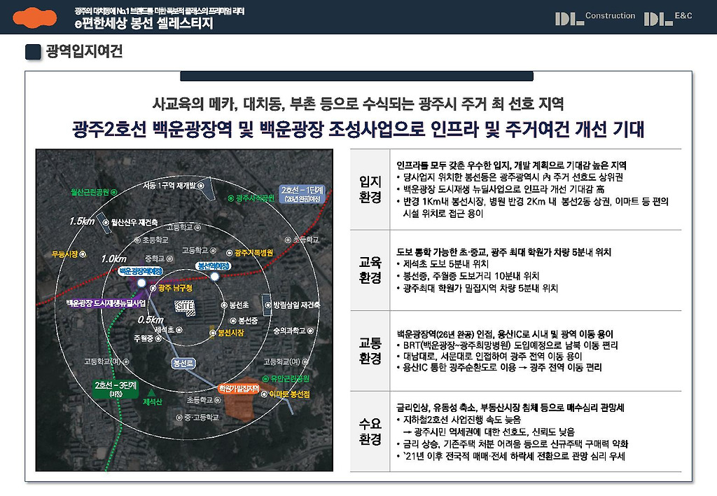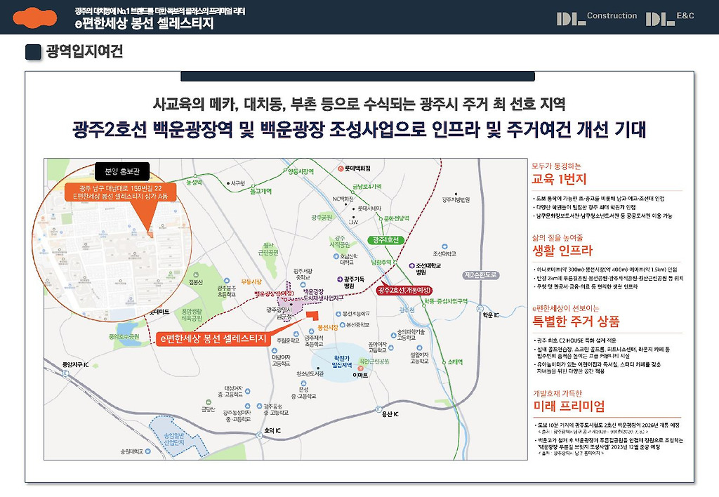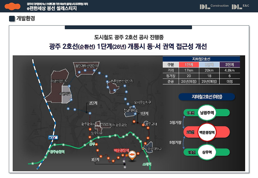 불과 2026년 하반기에는 광주 2호선 백운광장역이 운행될 것입니다. 이는 기존의 1호선이 직선형 구간임에 비해서 순환선으로 더욱 광주의 발전과 이동을 수월하게 해 줄 것이면서 백운광장 조성사업으로 인프라 및 주거여건이 획기적으로 개선 기대되고 있기에 실수요자 여러분은 이러한 호남의 최중심 도시인 광주광역시의 2호선 개통의 변화를 본인의 생활변화를 넘어서는 부동산 자산가치의 발전으로 이어짐을 확고히 인식해 주시길 당부드립니다.