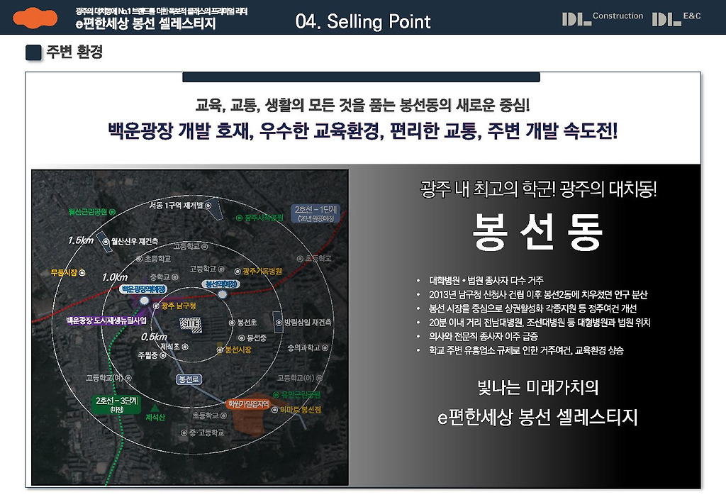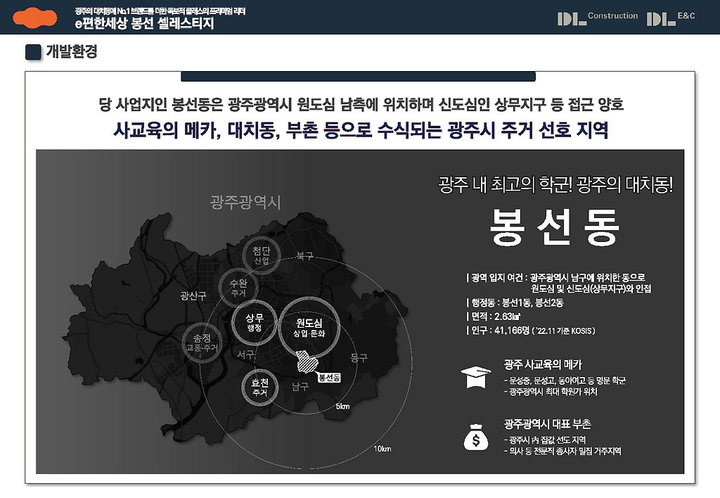 안녕하세요! 광주 교육 1번지에 건립되는 e편한세상 봉선 셀레스티지 아파트에 대한 분양 정보를 살펴보겠습니다. DL이엔씨(주) 1군 건설사의 브랜드로 실수요자와 투자자 모두에게 인정받는 단지이면서, 최근 소비자들이 주택 선택의 첫번째 요인으로 꼽는 교육이 최우선 가치를 품고 있기에 광주의 대치동이자 목동으로 자리한 이 단지에 실수요자 여러분은 많은 관심 권고드립니다.