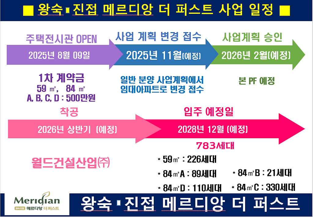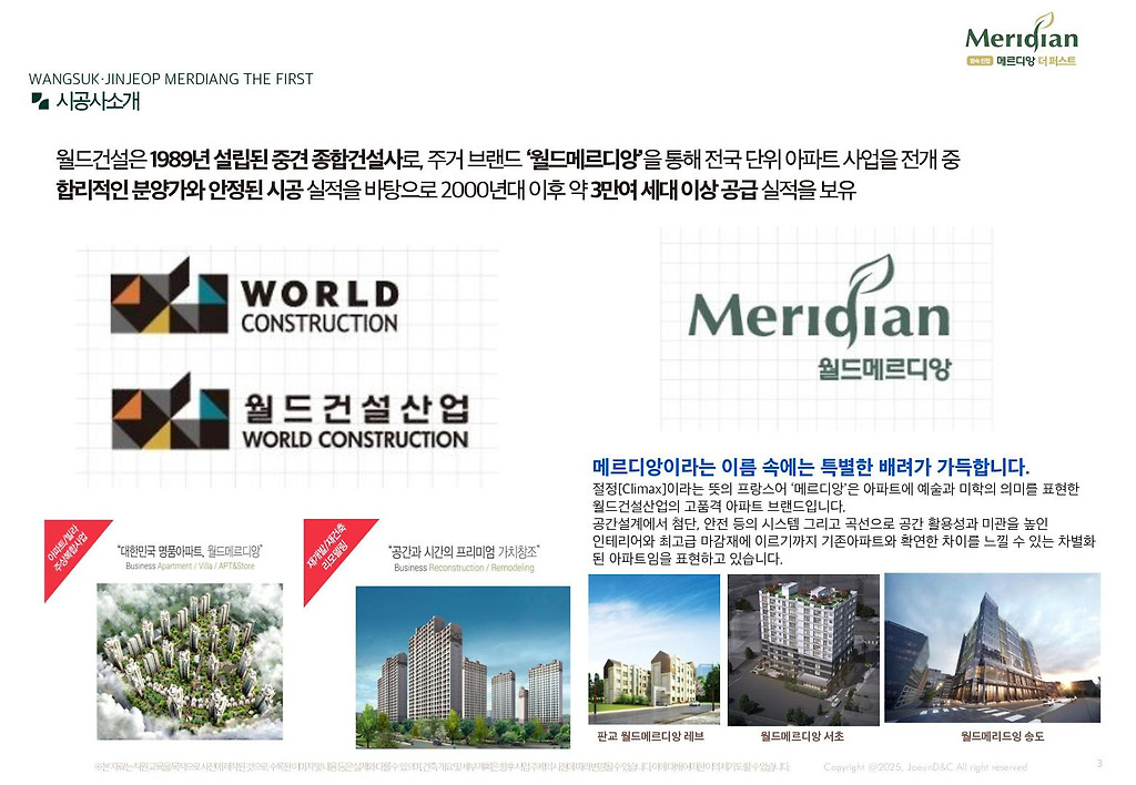 안전한 사업추진으로 토지확보도 원만하고 1998년부터 시공경험이 풍부한 중견건설사 월드건설산업 메르디앙 브랜드가 시공예정사로 참여할 계획이기에 실수요자 입장에서는 이번 공급물량에 많은 관심 권유드립니다