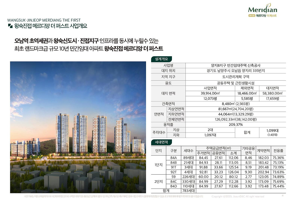 안녕하세요! 수도권 일원에서 보기 드문 민간임대아파트 주거상품을 소개하는 시간입니다. 브랜드네임은 왕숙진접 메르디앙 더퍼스트입니다.